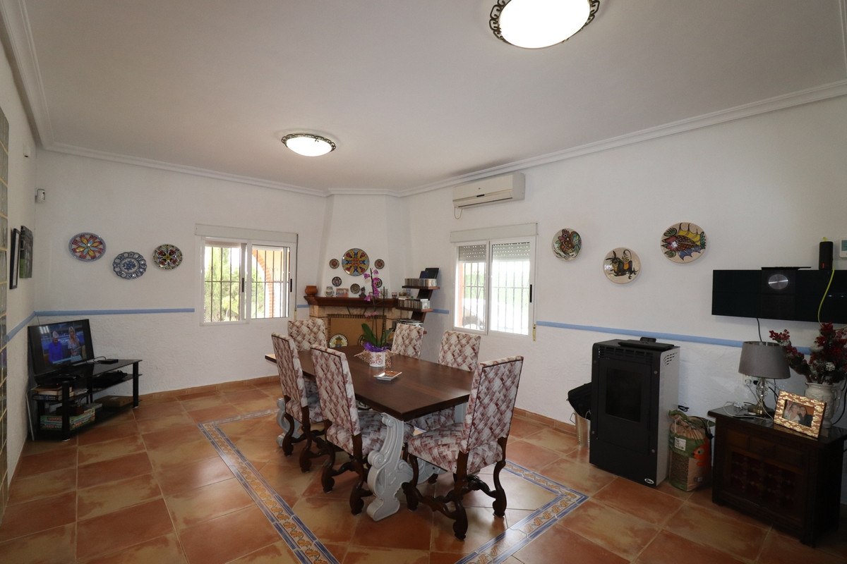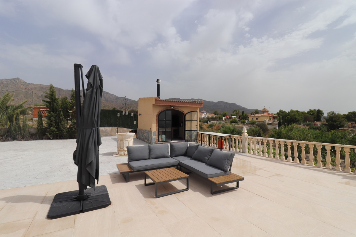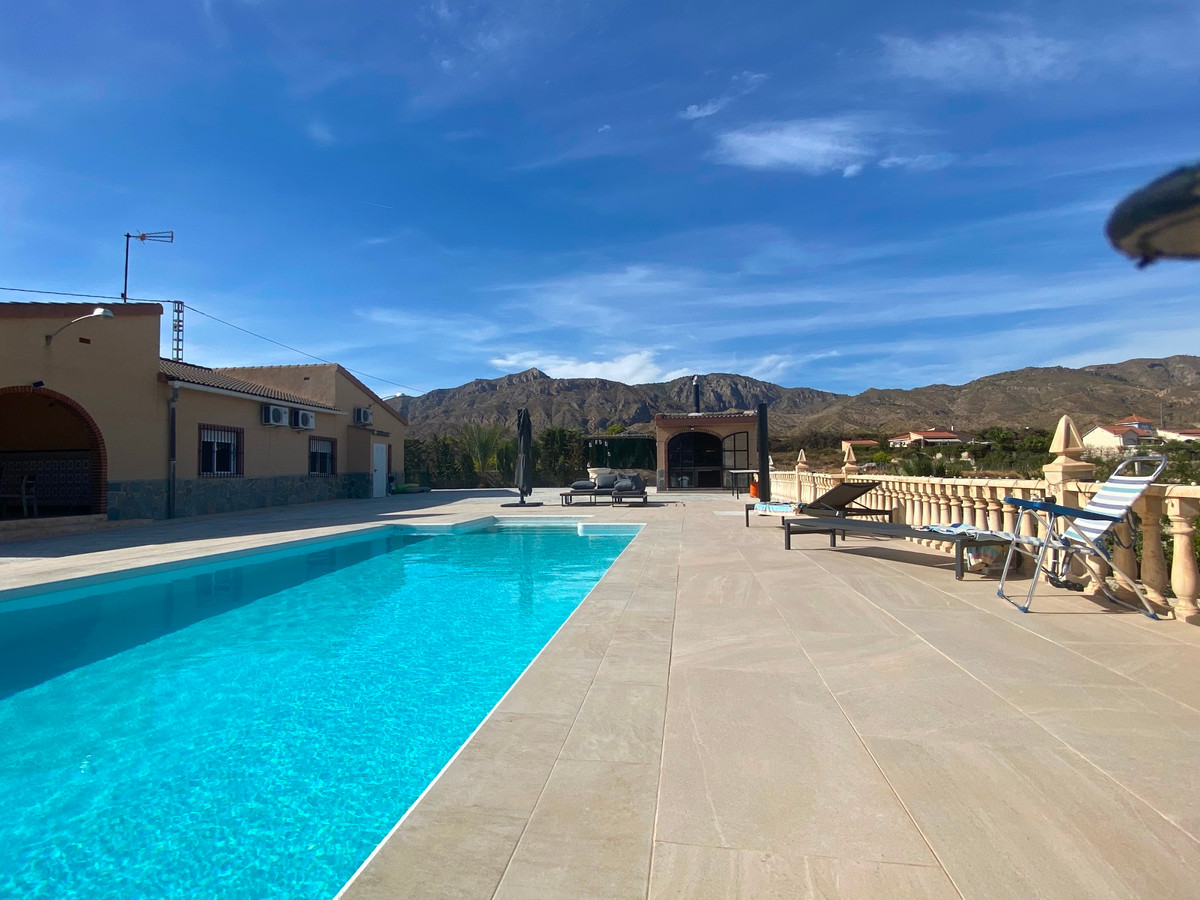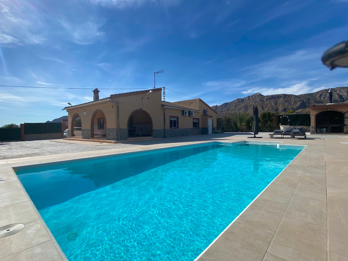 New listing direct from the owner! Beautiful detached country house in Albatera. This beautiful finca has neighbors but is privately located and has 4 very large bedrooms, each with air conditioning hot and cold. Upon entering the hallway, the living room and open kitchen are located on the left side of the house. The fully renovated bathroom has a walk-in shower and double sink. The open American kitchen is fully equipped with all necessary appliances and is in direct contact with the living room. The large living room has a fireplace but also a pallet burner and again an air conditioning cold and hot. The house is connected to electricity and water company Albatera. The wide veranda with direct contact with the large new swimming pool 10 x 5 and a separate outdoor kitchen with a professional barbecue makes outdoor living in this country house very pleasant. The large gardens and an olive grove give you a pleasant feeling of plenty of space and privacy. Located in a quiet area, 20 minutes from the beaches.