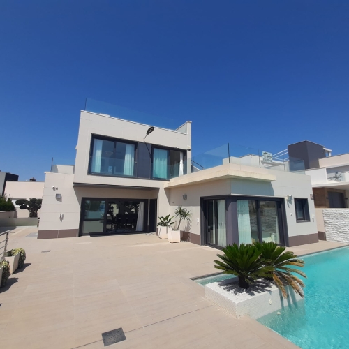 Residencial Vistabella, San Miguel de Salinas, corner villa with views of the sea and the salt lakes facing the park and facing South with a 405 m2 plot and a house on a 100 m2 floor with 3 bedrooms, 2 bathrooms, kitchen with its island open to the living room, gallery and a garage with direct access to the 153 m2 house, the house has a 60 m2 solarium, private pool and is sold furnished and with air conditioning.