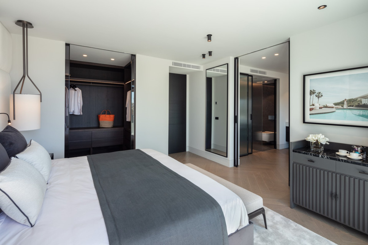Taking the flight of stairs up to the first floor, you will find two bedrooms, each with its own private terrace. The master suite is a true oasis, complete with a dressing area and an en-suite bathroom with a walk-in shower. From the first floor, you can enjoy panoramic views of the sea and the beautiful surroundings.