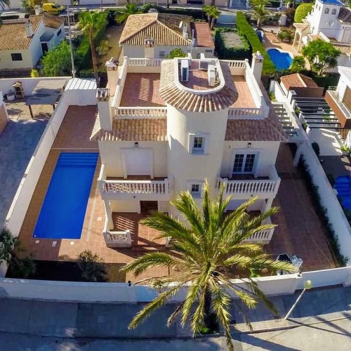 Discover the essence of luxury and tranquility in this magnificent detached villa located in Cabo Roig. With an impressive plot of nearly 1500 square meters, this property offers a unique coastal living experience.From the moment you enter the property, you will be greeted by meticulously maintained gardens that surround the villa, creating an atmosphere of serenity and privacy. The stunning architectural design is complemented by a private pool, where you can enjoy refreshing dips under the Mediterranean sun.This villa features a private garage to ensure the convenience and security of your vehicles. Additionally, its privileged location puts you just steps away from the beach and the picturesque promenade of Cabo Roig, providing you with direct access to the beauty of the sea.Upon entering the property, you will be welcomed by an elegant custom-made wooden staircase and carefully selected furnishings. The villa offers eight spacious bedrooms and four full bathrooms, ensuring ample space for the whole family and guests. The shaded terraces invite you to relax outdoors and enjoy the tranquility of the surroundings.This luxury property has been designed with attention to detail and is presented with high-quality furniture that brings warmth and sophistication to every corner of the villa.If you are looking for a luxurious detached villa in a privileged location, this property in Cabo Roig is the perfect choice. Don't miss the opportunity to live in a paradise of tranquility and beauty on the Costa Blanca.Contact us today for more information and to schedule a viewing of this exceptional luxury villa.