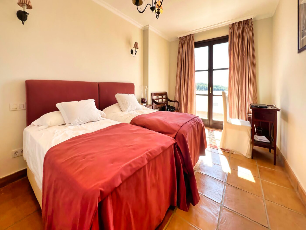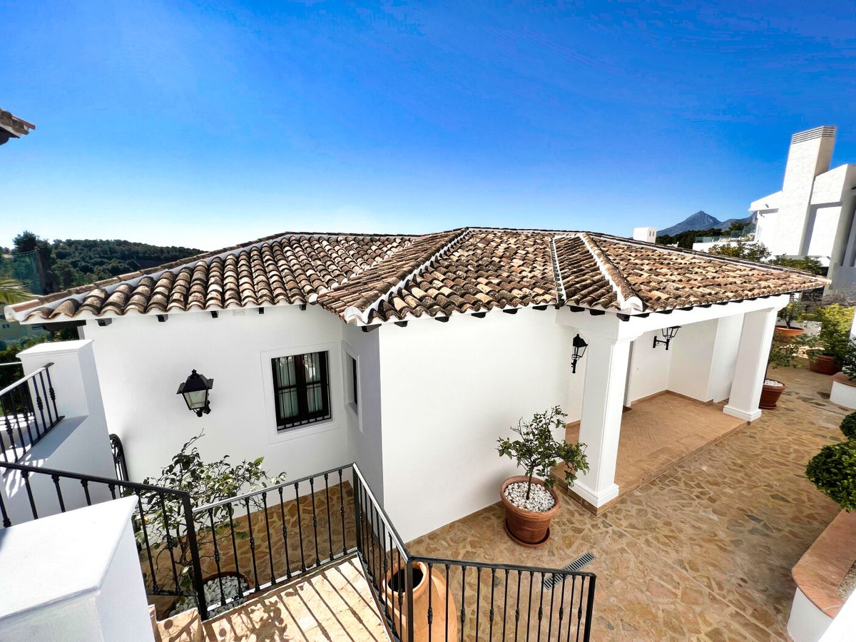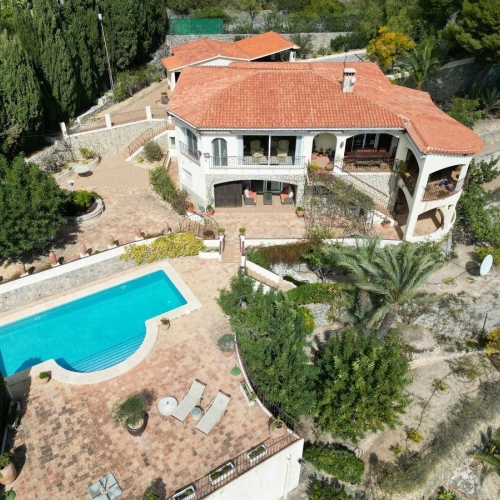 This impressive mediterranean villa was built in one of the most exclusive residential areas of Altea right by the Don Cayo Golf club. The villa can be accessed via en electric gate leading down to the parking area for two cars. The mansion is accessed on the top floor with its 4 bedrooms and 2 bathrooms and the grand staircase leading down to the middle and ground floor. In the center of the villa is the master bedroom with en-suite batroom and dressing room on one side and another large bedroom, again with en-suite bathroom and walk in wardrobe. Going further down the staircase we get to the large hall were on the one side of it we find the large living room and on the other side, the dining room, kitchen, guest toilet and utility room. All of the rooms on the ground floor lead outside to the large terrace with its beautiful veranda and outside dining area and bar just by the swimming pool.