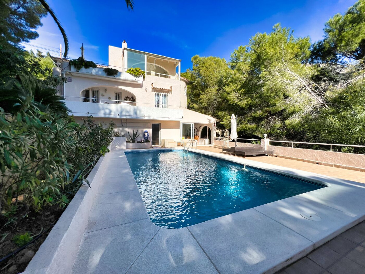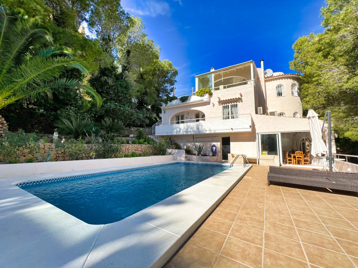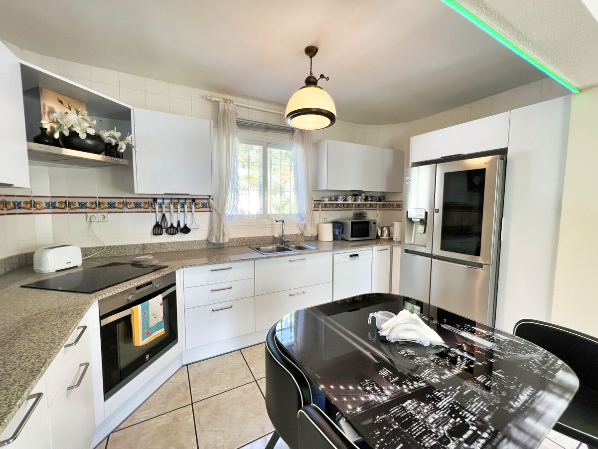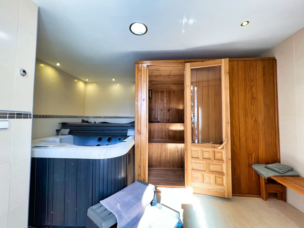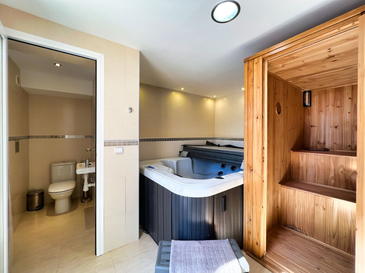 This villa is located in a very quiet residential area of Altea, just 400 metres distance to the Don Cayo Golf Club and 1.3km distance to the center of Altea la Vella with all the restaurants and shops. The property is built on three levels with the living / dining room, open plan kitchen, master bedroom with en-suite bathroom and guest toilet being on the top floor which is also where the main entrance is located. On the middle floor we find another living room with bar, 3 bedrooms, a laundry room and one bathroom. On the lower floor is the guest loft with bathroom and the spa area with jacuzzi, sauna and bathroom. On the same level as the guest loft we have an outdoor summer kitchen with barbecue and sitting area just by the heated saltwater swimmingpool. The garden area of the villa is well kept and there is as well a nice pavillion with gas fireplace where you can enjoy the outdoors even in winter.
