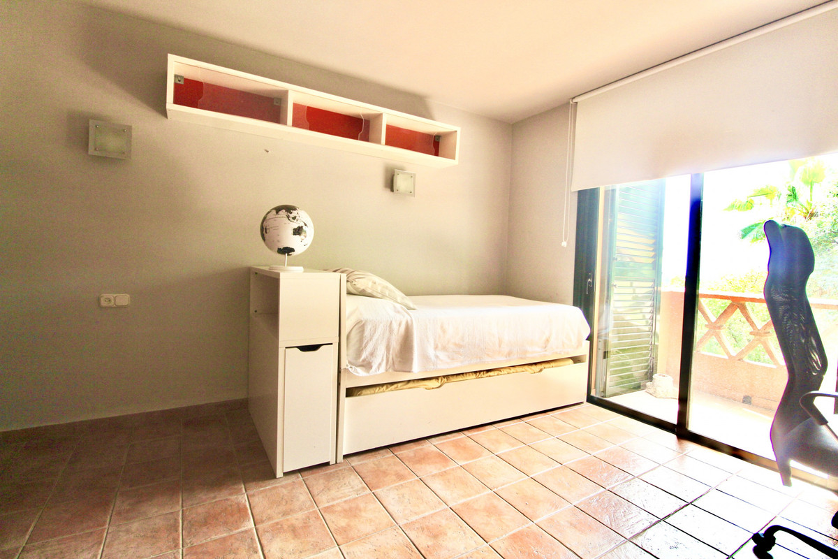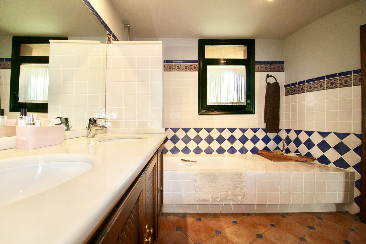 Large terrace with dining area and seating area in front of the pool. All surrounded by a large green area with magnificent trees.