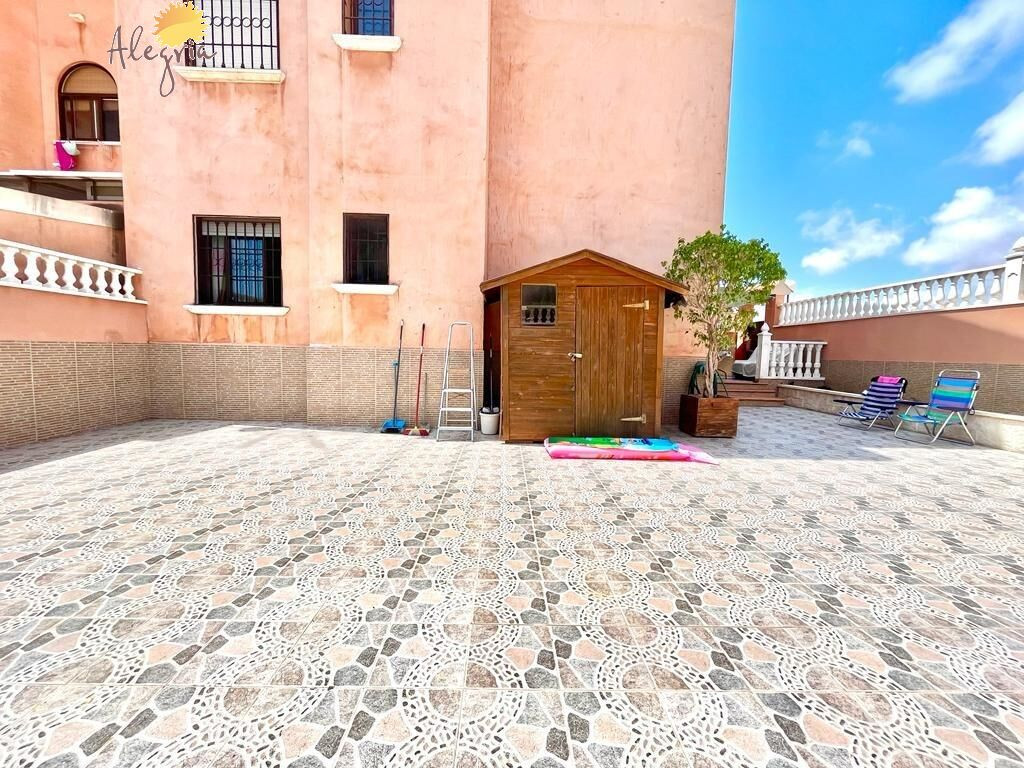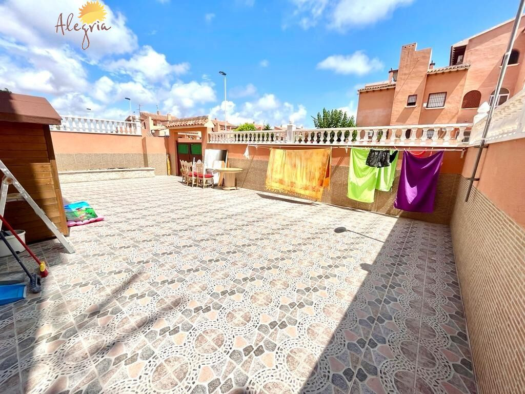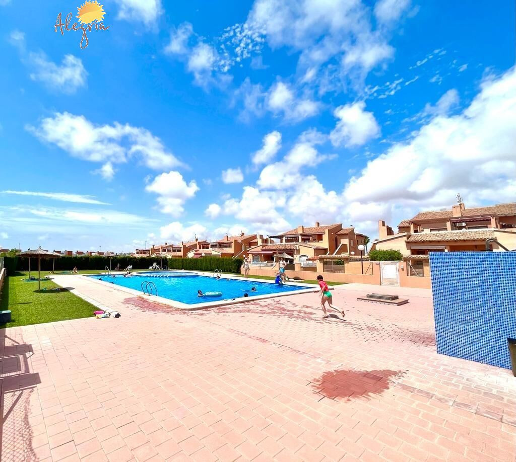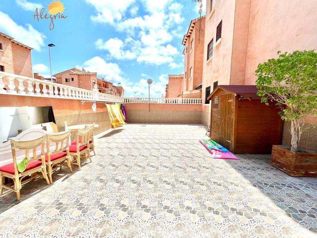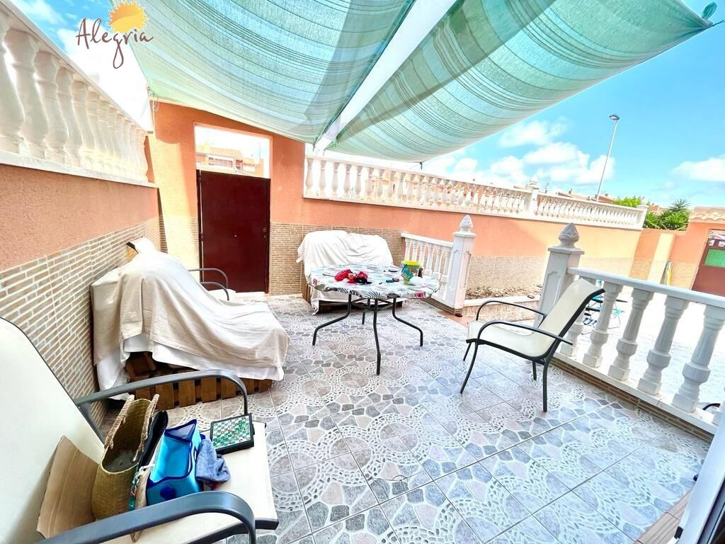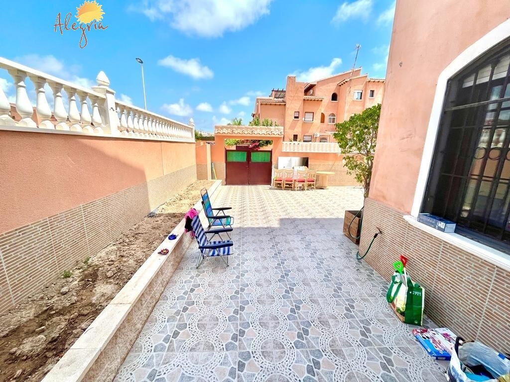 Ground Floor Bungalow in Torrevieja, Aguas Nuevas area, 61 m2. of surface, 104 m2 of terrace, 800 m. from the beach (10 minutes walk from the sea and 5 minutes by car), 2 double bedrooms (bright with fitted wardrobes), a bathroom (spacious), semi-renovated property, beech interior carpentry, west facing, porcelain stoneware floor, carpentry aluminum / climalit exterior.Extras: water, fitted wardrobes, corner, bright, light, furniture, patio, community pool, terrace (impressive sunny terrace), buses (a few minutes from the bus stops), trees, downtown (surrounded by all services). , shopping centers, medical centers, schools, coast, hospitals, parks, supermarkets, urbanization.Parking included (in the same plot)