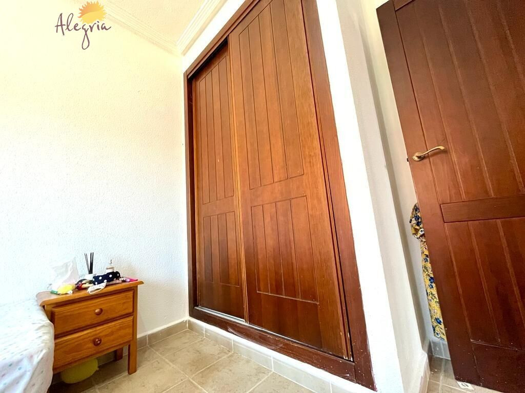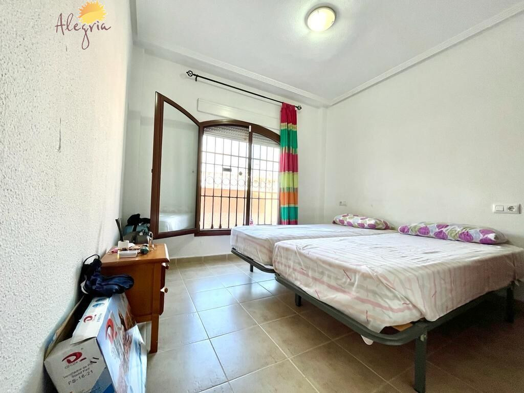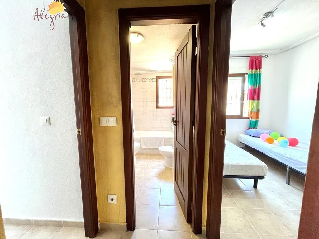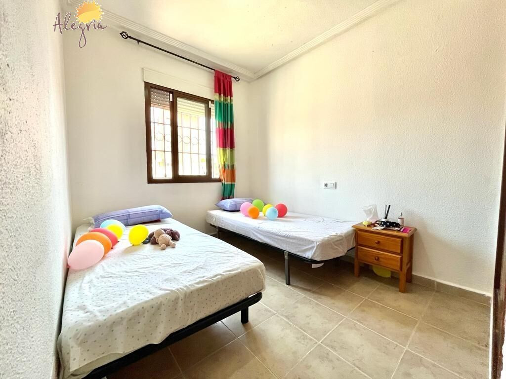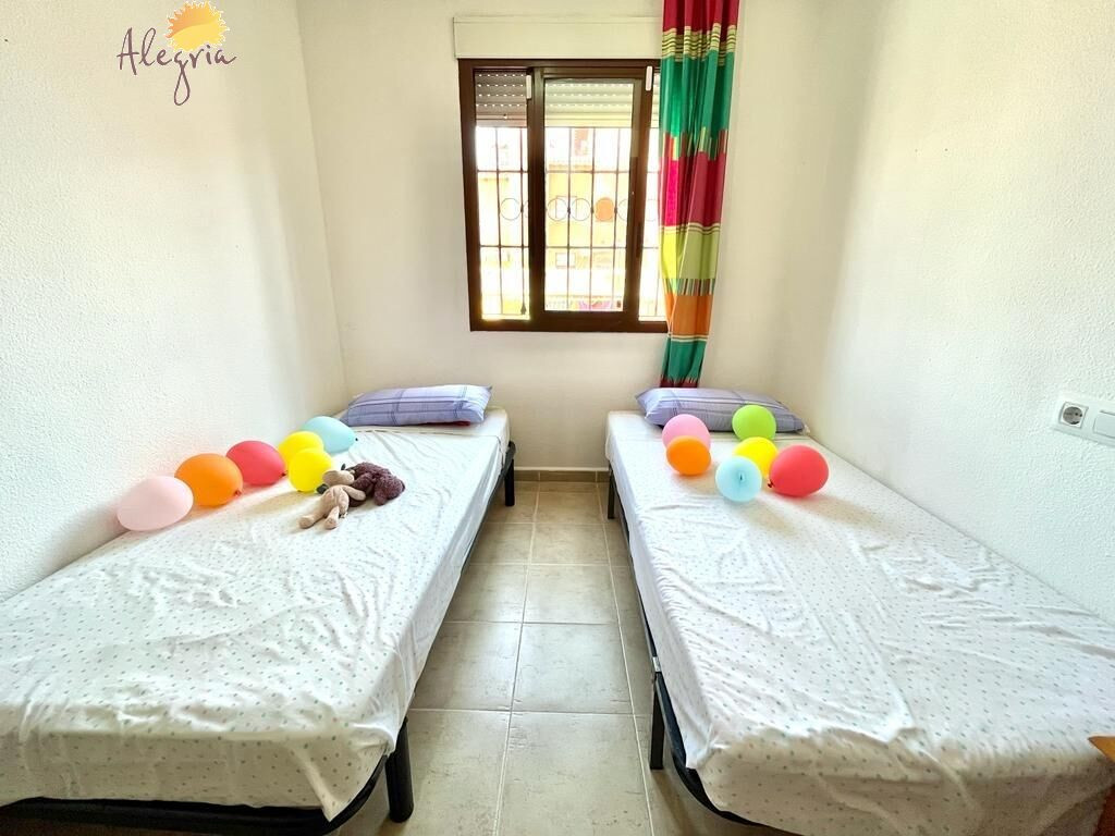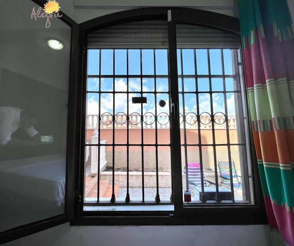 Ground Floor Bungalow in Torrevieja, Aguas Nuevas area, 61 m2. of surface, 104 m2 of terrace, 800 m. from the beach (10 minutes walk from the sea and 5 minutes by car), 2 double bedrooms (bright with fitted wardrobes), a bathroom (spacious), semi-renovated property, beech interior carpentry, west facing, porcelain stoneware floor, carpentry aluminum / climalit exterior.Extras: water, fitted wardrobes, corner, bright, light, furniture, patio, community pool, terrace (impressive sunny terrace), buses (a few minutes from the bus stops), trees, downtown (surrounded by all services). , shopping centers, medical centers, schools, coast, hospitals, parks, supermarkets, urbanization.Parking included (in the same plot)