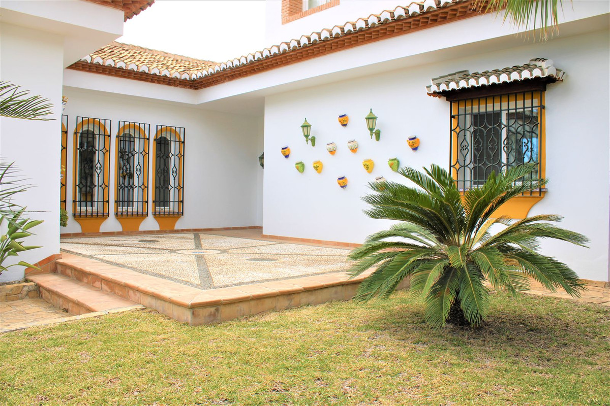 Från vardagsrummet kliver du ut på husets pärla, en stor täckt terrass med underbar utsikt över Alboranhavet och Cerro Gordos berg. Den omgivande trädgården med sin frodiga gräsmatta och uppfriskande pool är den perfekta platsen för solbad och svalka under heta dagar, samt för avkoppling med familj och vänner på kvällen. Terrassen är vackert dekorerad med autentiska pelare.