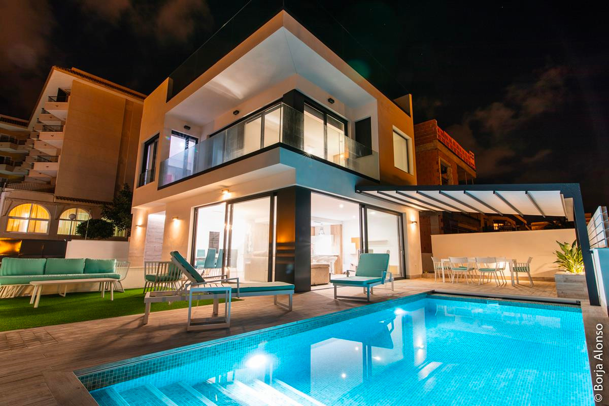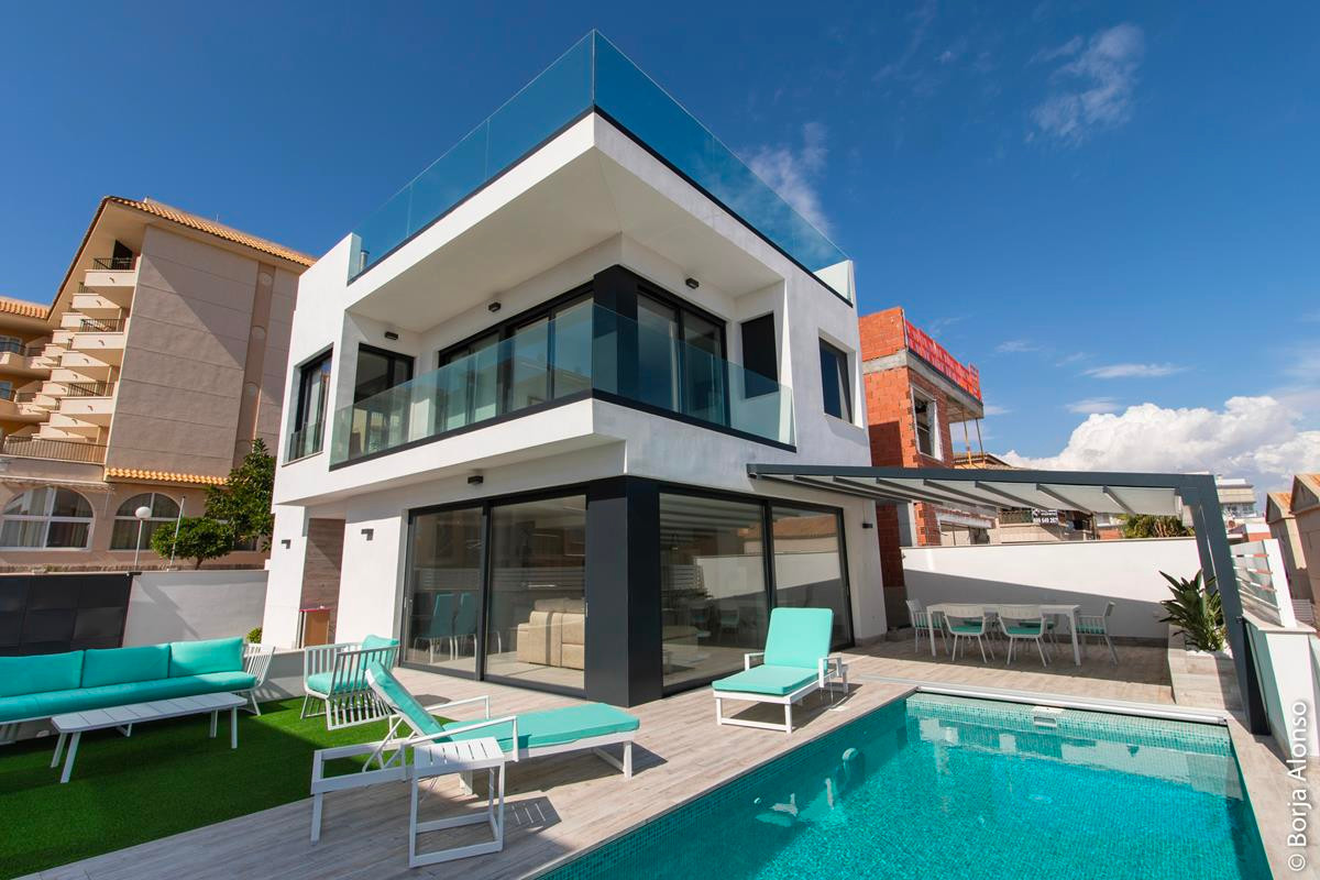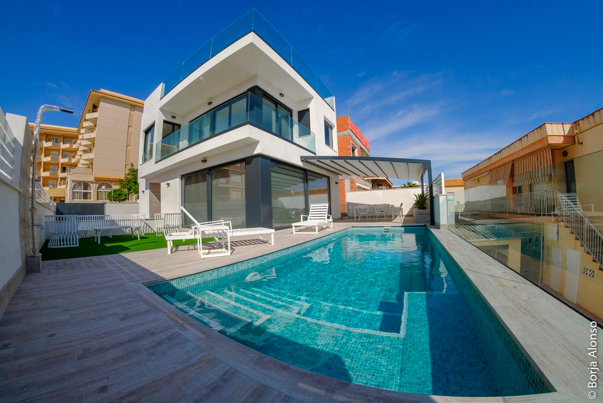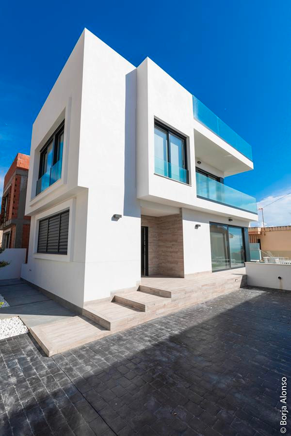 Beautiful villa situated just a few steps from the central beach of Guardamar del Segura. Built in 2018.Luxury, modern house that boasts top quality features and makes it suitable for comfortable living all year round. The house consists of 4 levels - basement, ground floor, first floor and roof terrace. The main entrance on the ground floor leading into a large living area with a big open-type kitchen with a large kitchen island and built-in electric appliances. Large, ceiling height sliding windows give access to the pool and garden area. There is also one full bathroom and laundry room on the ground floor. On the first floor we will find 2 bedrooms with 1 shared bathroom with double sink and walk-in shower. The gorgeous master suite has a big built-in wardrobe and a fantastic open bathroom with a rain shower and a bathtub , from which you can enjoy magnificent sea views. All bedrooms on the first floor have access to the terrace. Huge roof terrace is a wonderful spot to enjoy a fantastic panoramic view of Guardamar beach area. Probably the best spot in the house with stunning sea views and a great place to enjoy evening breeze in summer.The basement level offers windows for natural light , 2 additional double bedroom, second lounge area and a playroom for kids. Also the technical room with pool machines and Aerothermal heating system is situated in the basement. The house is built on a private plot with the total area of 280 m2 and has a private swimming pool 6m x 3m, outdoor shower, sunbathing area, covered area with a foldable awning and a open parking space for 2 vehicles. Motorized garage door, outdoor led lighting. Aluminium windows with double glass and thermal break chamber for better soundproofing and thermal insulation. Centralised air-conditioning system with separate remote control for each level. Aerothermal floor heating system on the ground and first floors. Heated floors in bathrooms. Electric windows shutters in the bedroom. Automatic interior window blinds in the living room. Ceramic floor with wooden pattern throughout the house. The house is situated in the second beach line of Guardamar del Segura, with absolutely all services and amenities available within walking distance. 10-minute walk to the town centre, 40-minute drive to Alicante airport, 1-hour drive to Alicante city, 20-minute drive to Torrevieja hospital, 15-minute drive to the nearest golf course.Furniture and electric appliances are included in the price. Taxes, purchase and legal costs are not included in the price.