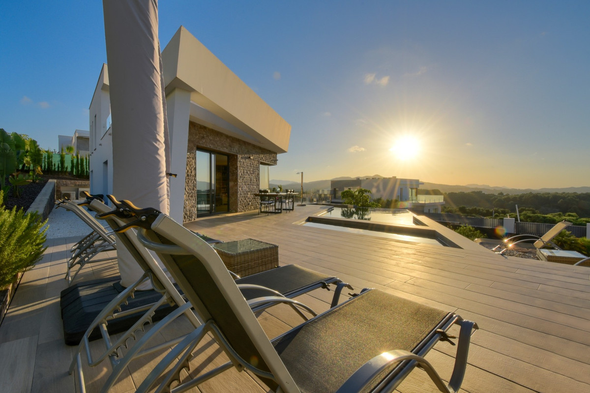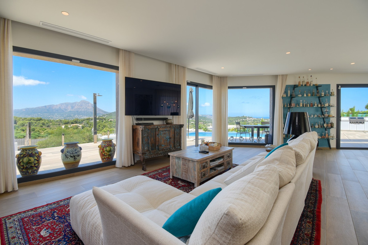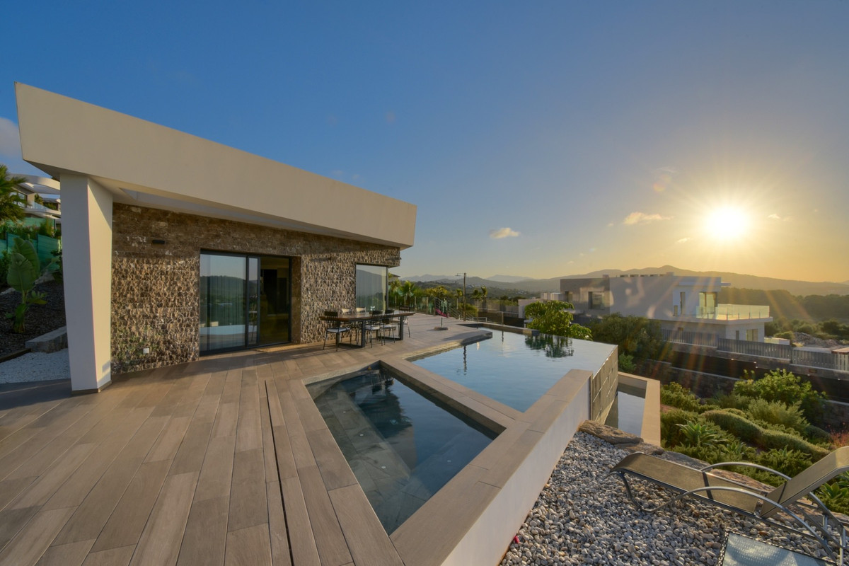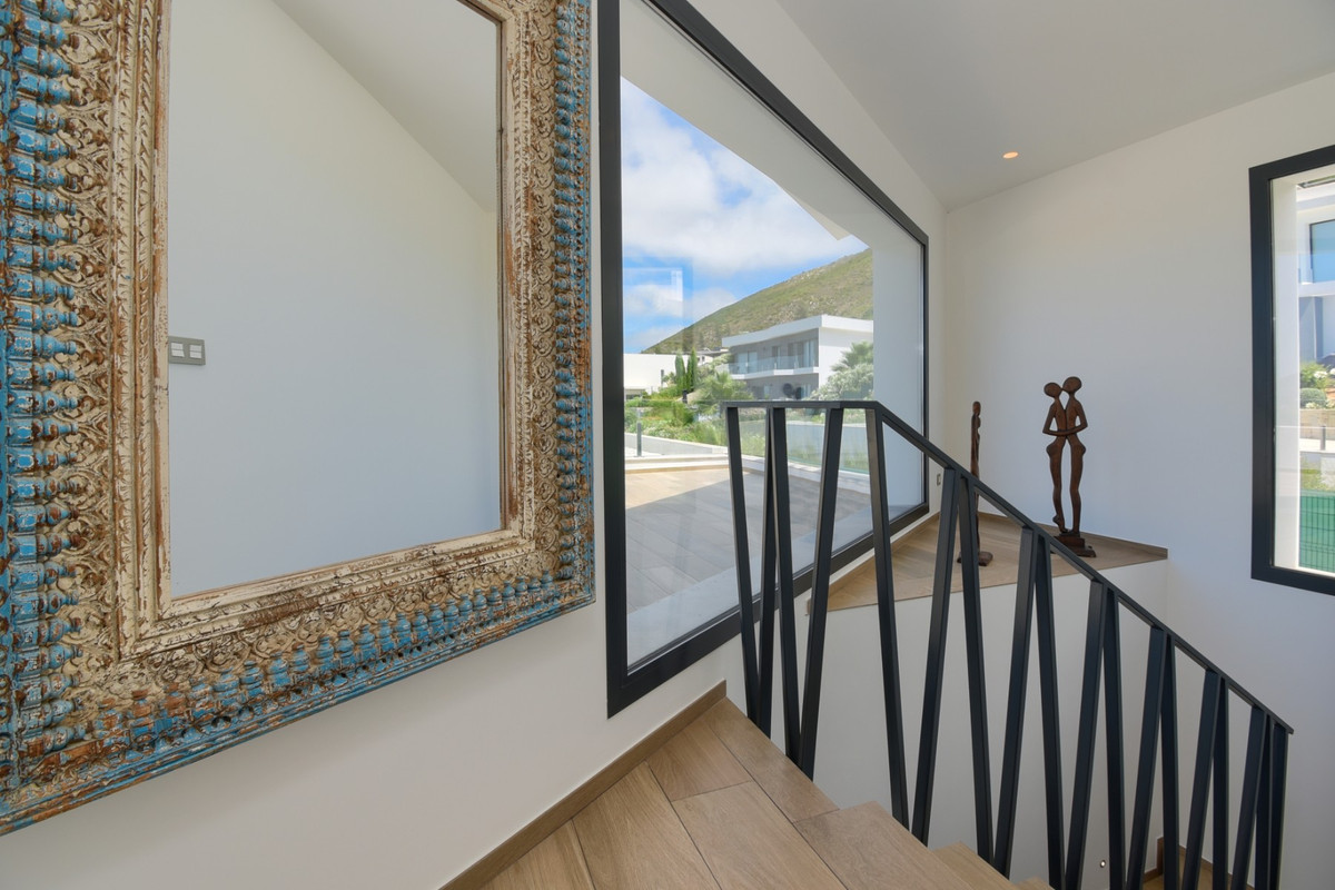 Villa built in 2020, located in the luxurious residential area of Monte Olimpo in Jávea, a few minutes from the beach, schools, restaurants, supermarkets, and the Golf course. This beautiful and modern villa with natural stone on part of the facade has views of the sea, the mountains and the valley.\n