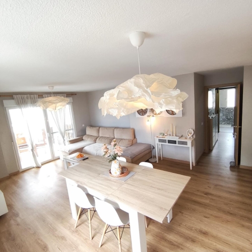 The living area is distributed over two levels and includes: a spacious living room with dining area, an open, fully equipped kitchen with an island, 2 bedrooms (both with ensuite, one with access to a terrace), 2 bathrooms, a guest toilet and 3 sunny terraces.