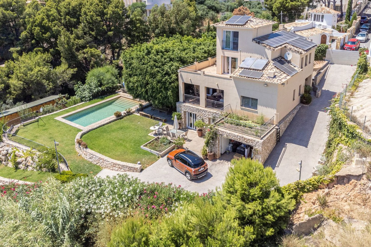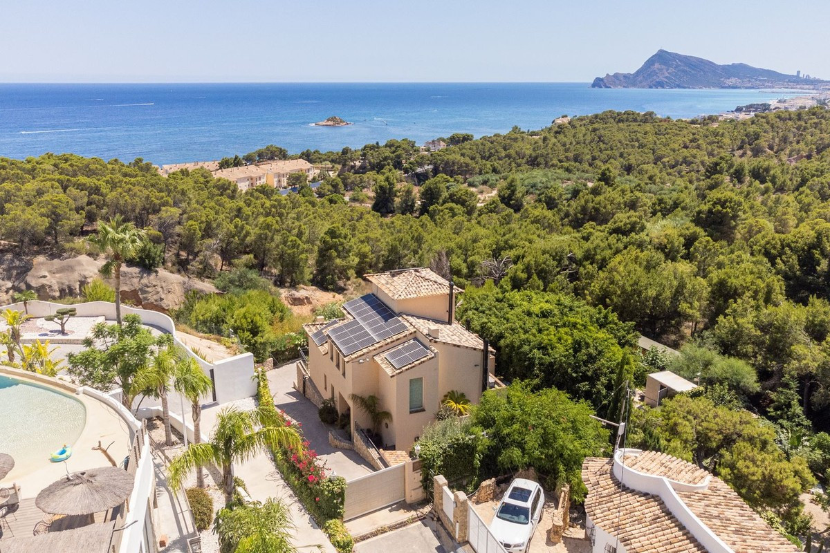 This modern and exclusive estate is located in a location close to both the beach and the island of L'Olla in Altea, as well as the exclusive marina of Greenwich in Altea Norte. It is a true oasis of peace and serenity, with stunning views of the natural landscape and the Mediterranean Sea. This unique, multi-level property offers sea views from all floors. It is a luxurious, high-quality construction in perfect condition, with dreamlike interiors. The main residence has three large bedrooms, while the guest annex has two rooms.\n