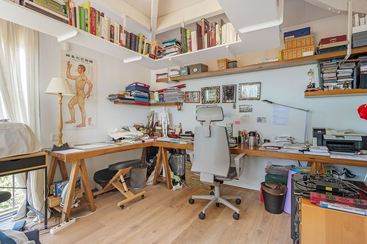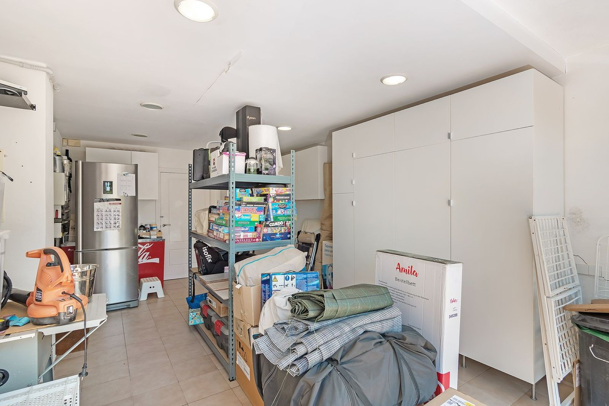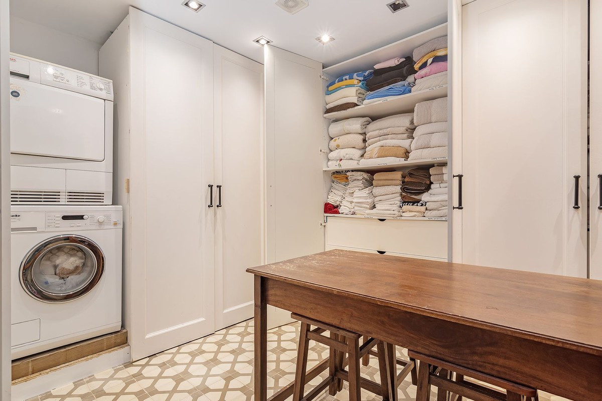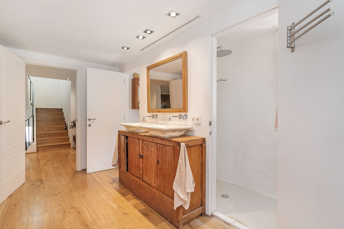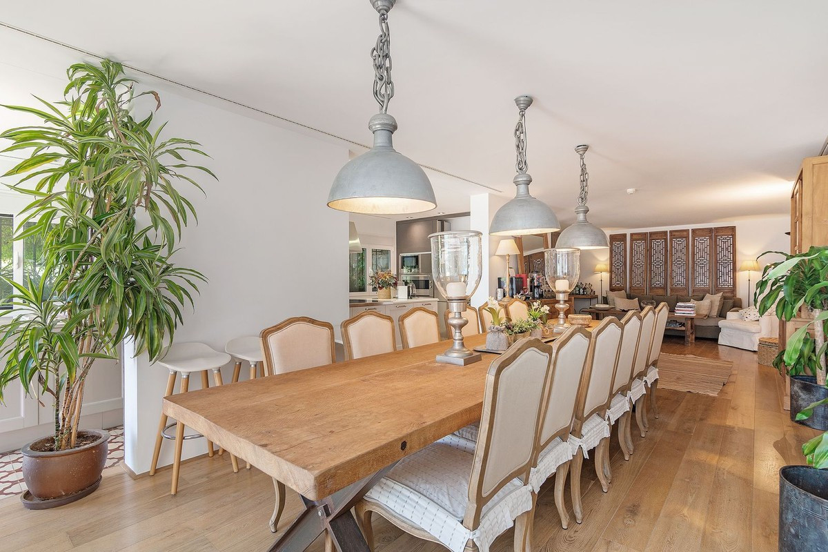Floor 1 : You can access this floor through the main entrance, down the wooden stairs or from the garden through numerous sliding doors that open to the patio and garage. On this floor, you will find a hall, a guest toilet, a large workshop, a storage room and a garage. There is also a lounge with a fireplace and doors opening onto the terrace and garden. A large living room and a spacious kitchen fully equipped with high-end appliances. The living room, kitchen and dining area together measure a total of 70 square meters, and both the kitchen and dining room have access to the outside through sliding doors.\n
