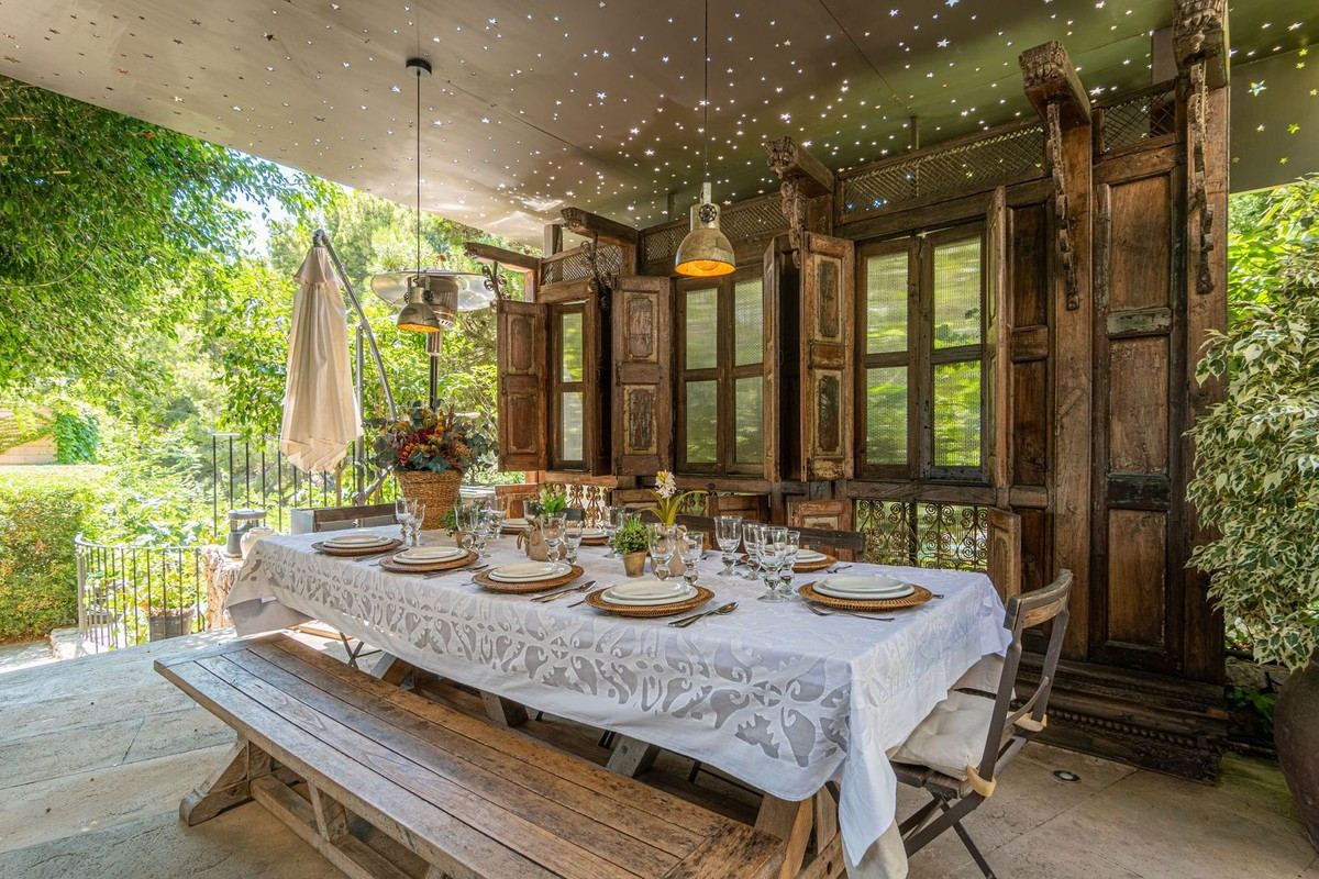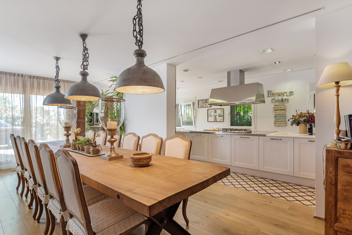 Regarding the exteriors, there is a driveway that leads to the garage. The mature, lush gardens are well maintained, with lawn areas and large trees providing shade and a cool environment even in summer. There is also a barbecue in the indoor kitchen, right next to the outdoor dining room. The large rectangular pool is built with stone and has saline water.\n