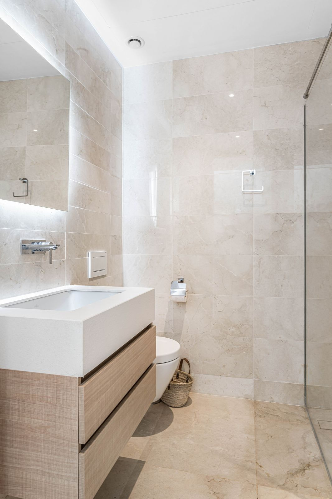 On the main floor there is a modern fully equipped kitchen with dinning area connected to the living room, and option of opening up the terrace with access to the garden.