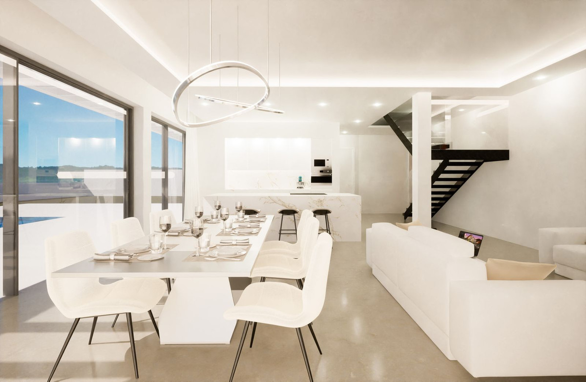 Villans entré öppnar sig i en rymlig hall med garderober, som leder till det rymliga vardagsrummet med öppet kök med en integrerad köksö. Stora energieffektiva fönster från golv till tak ger dig direkt tillgång till poolen och trädgården. Det finns också en gästtoalett på bottenvåningen.