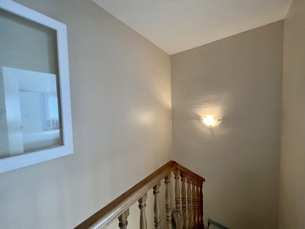 On the lower level there is a bright lounge with a working fire place and a sunny terrace with nice views over the pool and gardens. On this floor there is also the kitchen with a utility terrace.