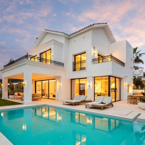 This magnificent villa is an open plan one, and the ground floor flows into the terrace and the garden with lovely sea views and a vast infinity pool, leading to a chill-out area with a fireplace. The villa has ensuite bedrooms on each floor, which gives you 100% privacy.
