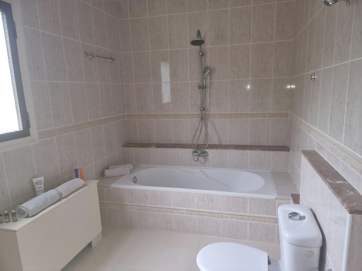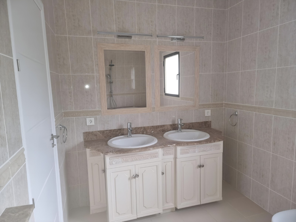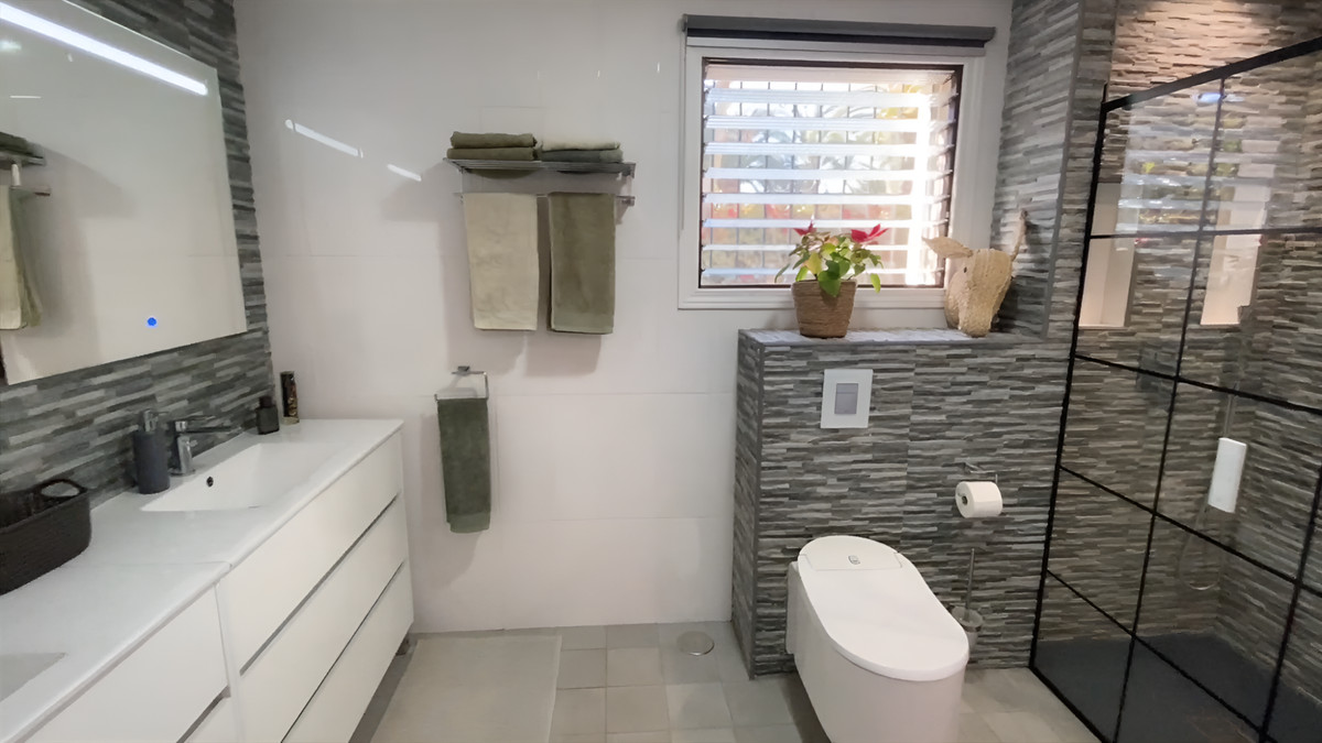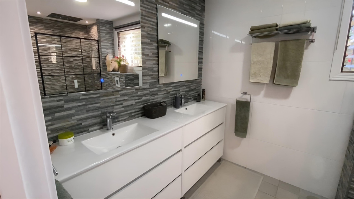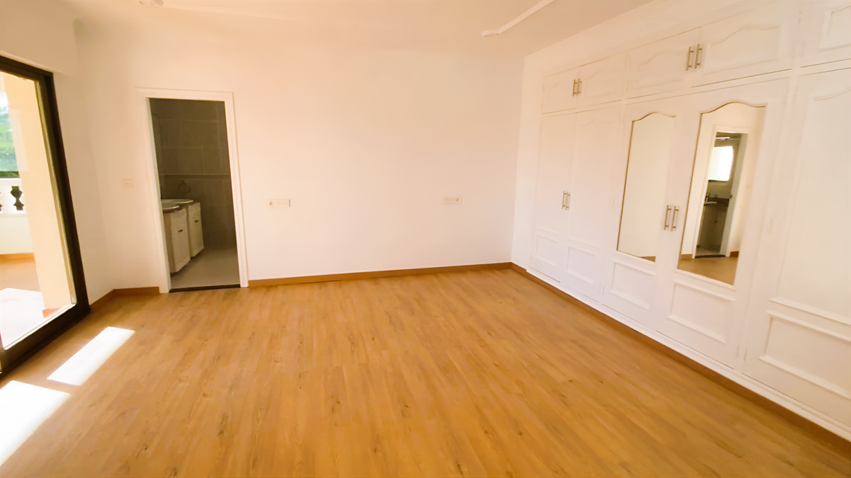 The villa is distributed over two independent floors , both boasting luxurious living rooms , designer kitchens , and a total of six double bedrooms with built-in wardrobes . In addition, it has four full bathrooms , two of them en suite , and a guest toilet . We cannot forget the surprise hidden on the third floor: a majestic room of almost 30 square meters with its own patio .\n