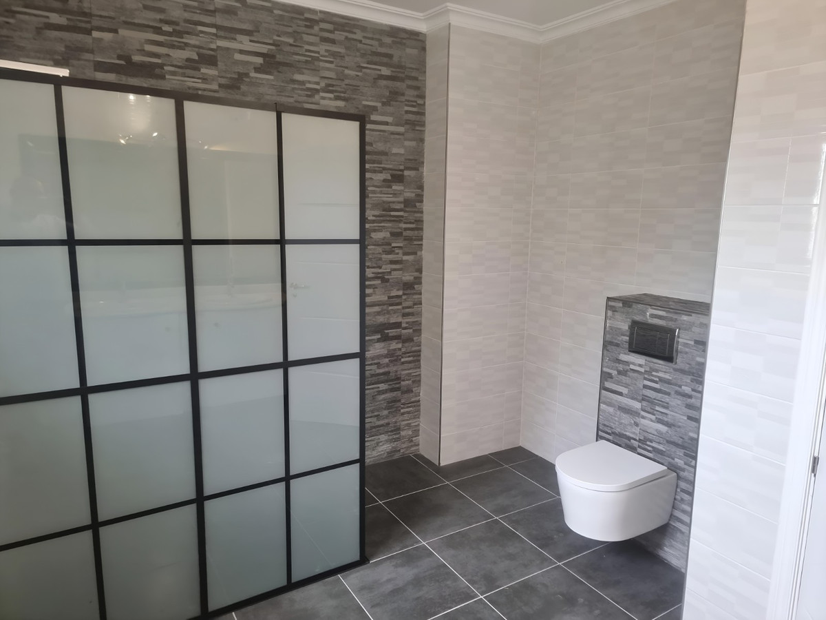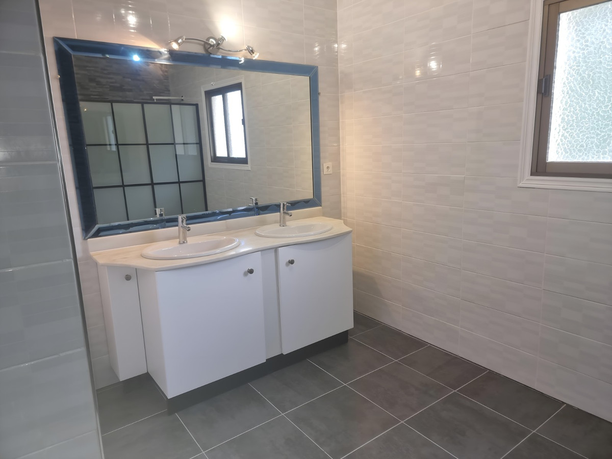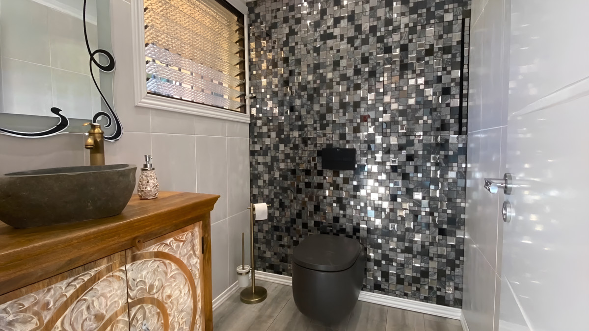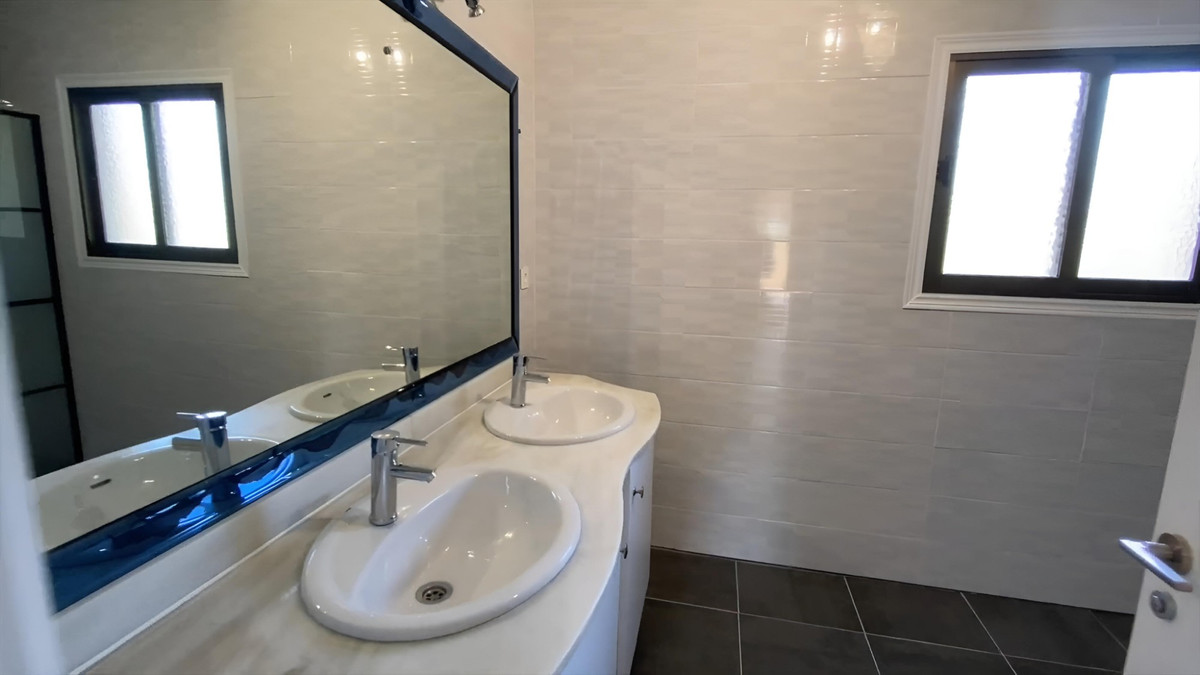The villa is distributed over two independent floors , both boasting luxurious living rooms , designer kitchens , and a total of six double bedrooms with built-in wardrobes . In addition, it has four full bathrooms , two of them en suite , and a guest toilet . We cannot forget the surprise hidden on the third floor: a majestic room of almost 30 square meters with its own patio .\n