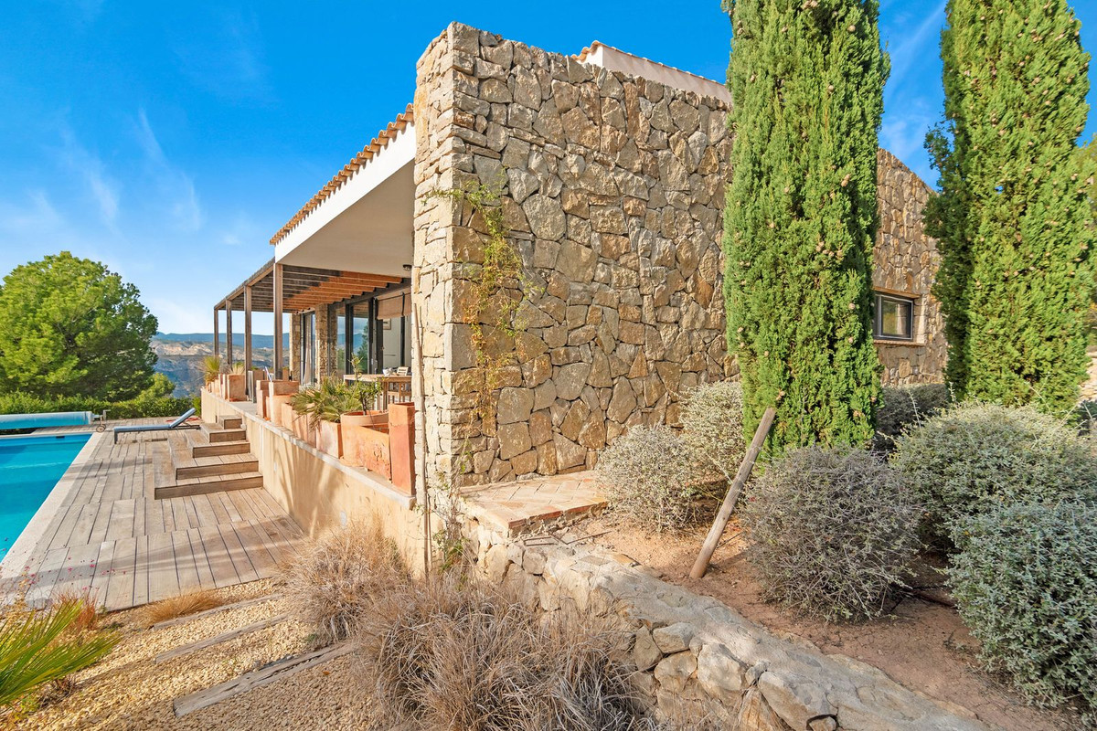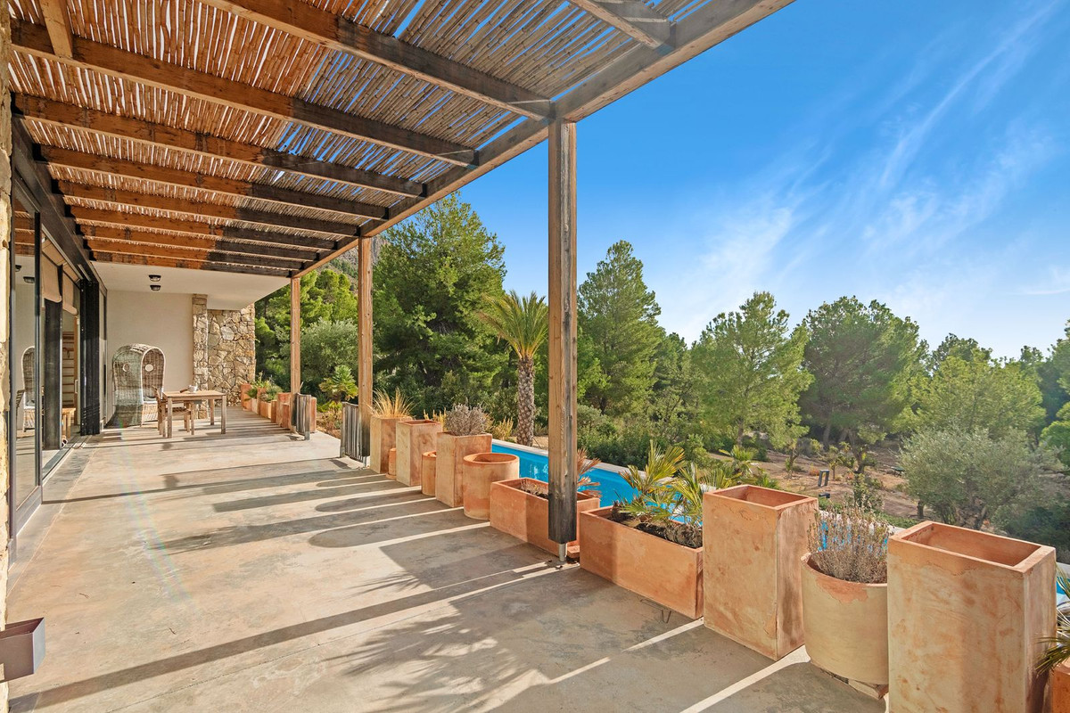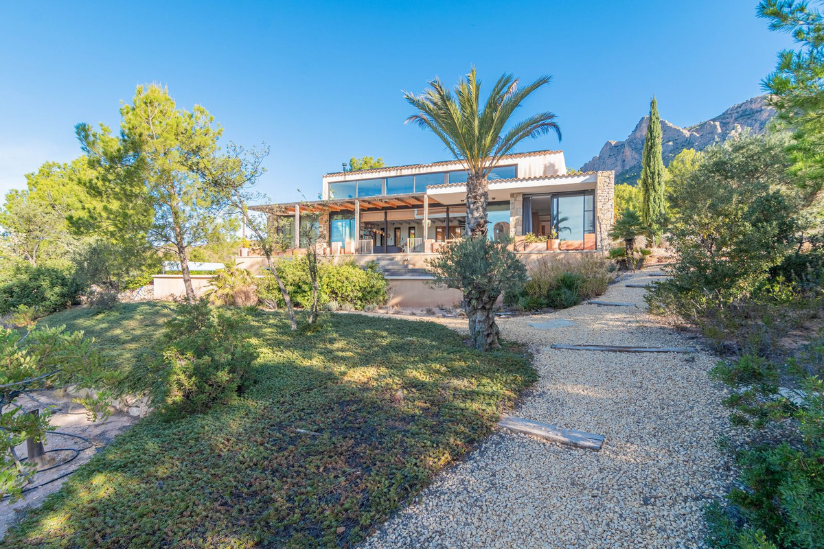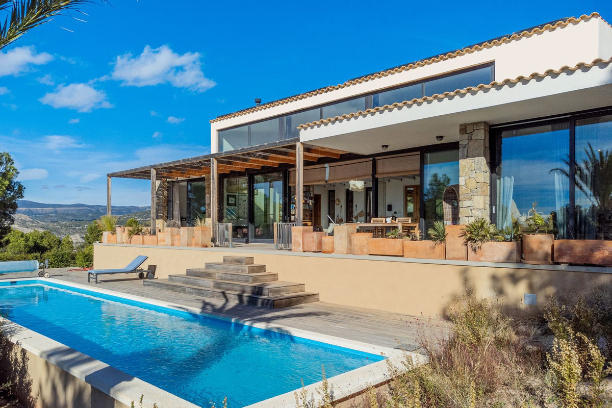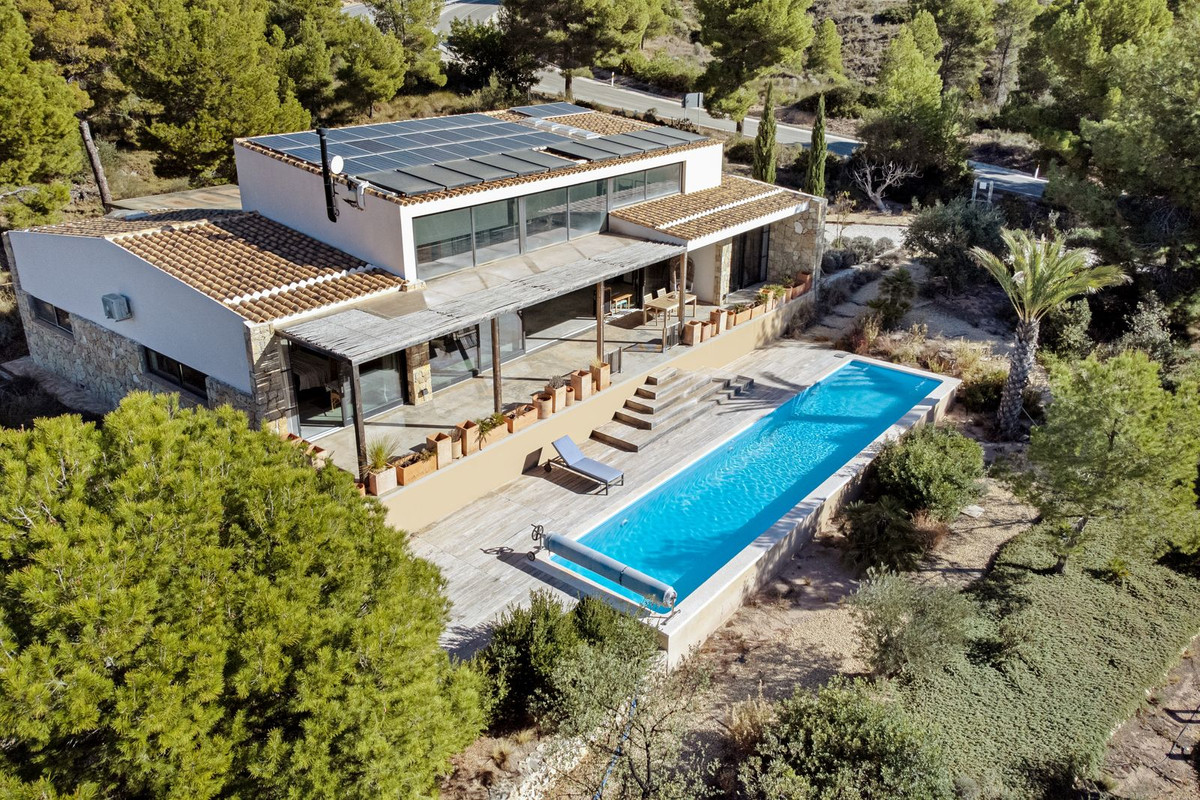 Located at the foot of the Cabeza D'or mountain, this impressive, contemporary residence spans over 250 m² on a private plot of more than 21,000 m². In an enviable natural setting, Villa Natura is just five minutes from the village of Busot, 15 minutes from the beaches of El Campello-San Juan, and 25–30 minutes from Alicante and its international airport.