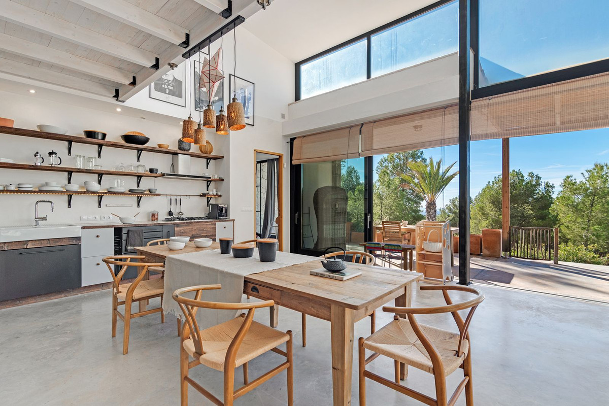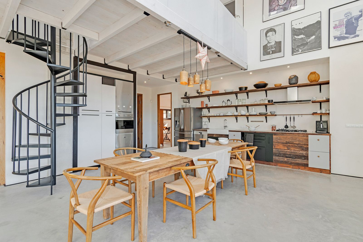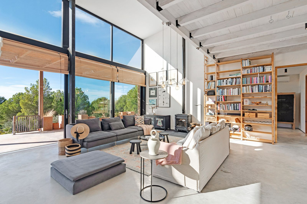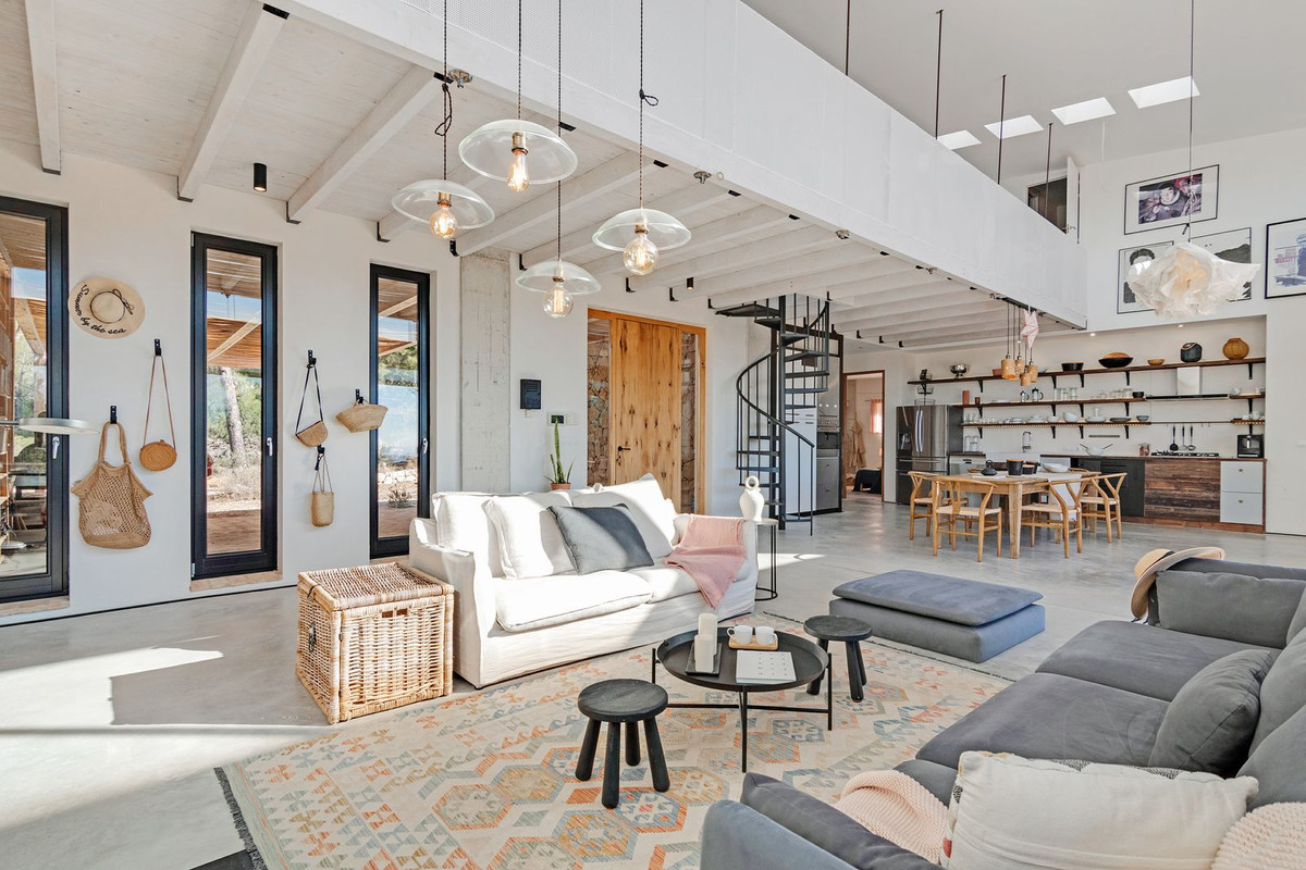 The open-plan, loft-style layout features high double ceilings, glass walls, and carefully curated décor. The lounge–kitchen–dining area opens onto a landscaped garden with a saltwater swimming pool and pine-filled horizon.