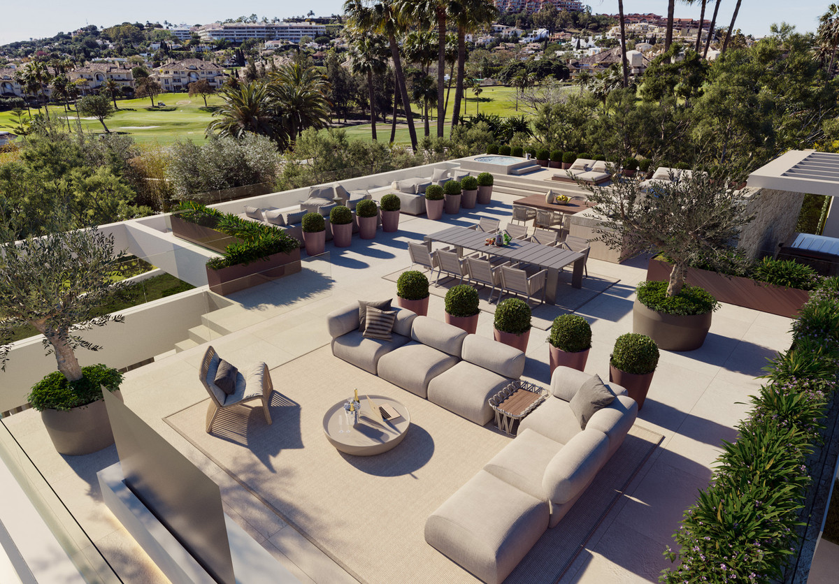 Förhöj dina underhållningsambitioner på takterrassen - en dröm som går i uppfyllelse för dem som älskar att vara värd. Här hittar du ett utomhuskök, rymliga sitt- och matplatser, en utomhusbio och ett lyxigt DROP-spa. Från denna utsiktspunkt kan du njuta av enastående utsikt över golfbanan och den pittoreska dalen, vilket skapar en atmosfär av ren sofistikation.