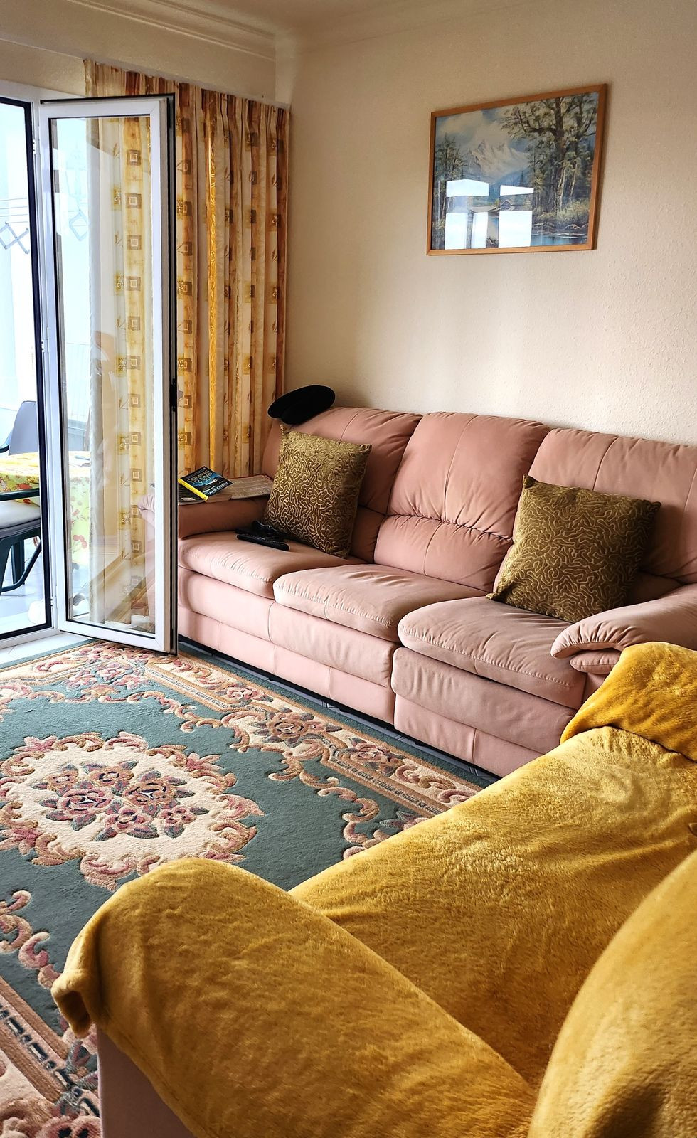 Spacious lounge leading to a terrace with glass curtains already in place.