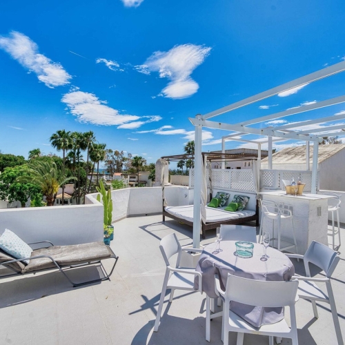 Beautiful and charming 2 bedroom corner duplex penthouse located in an exclusive urbanisation in Elviria, just a 3 minute walk to probably the best beach of Marbella east and to the Elviria Commercial Centre.