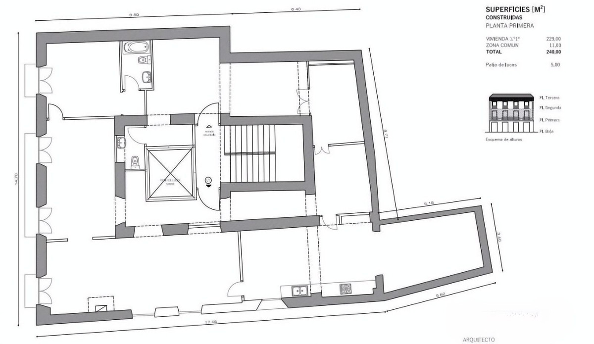 Denna byggnad är uppdelad i totalt 4 våningar; Det vill säga en bottenvåning plus 3 våningar.