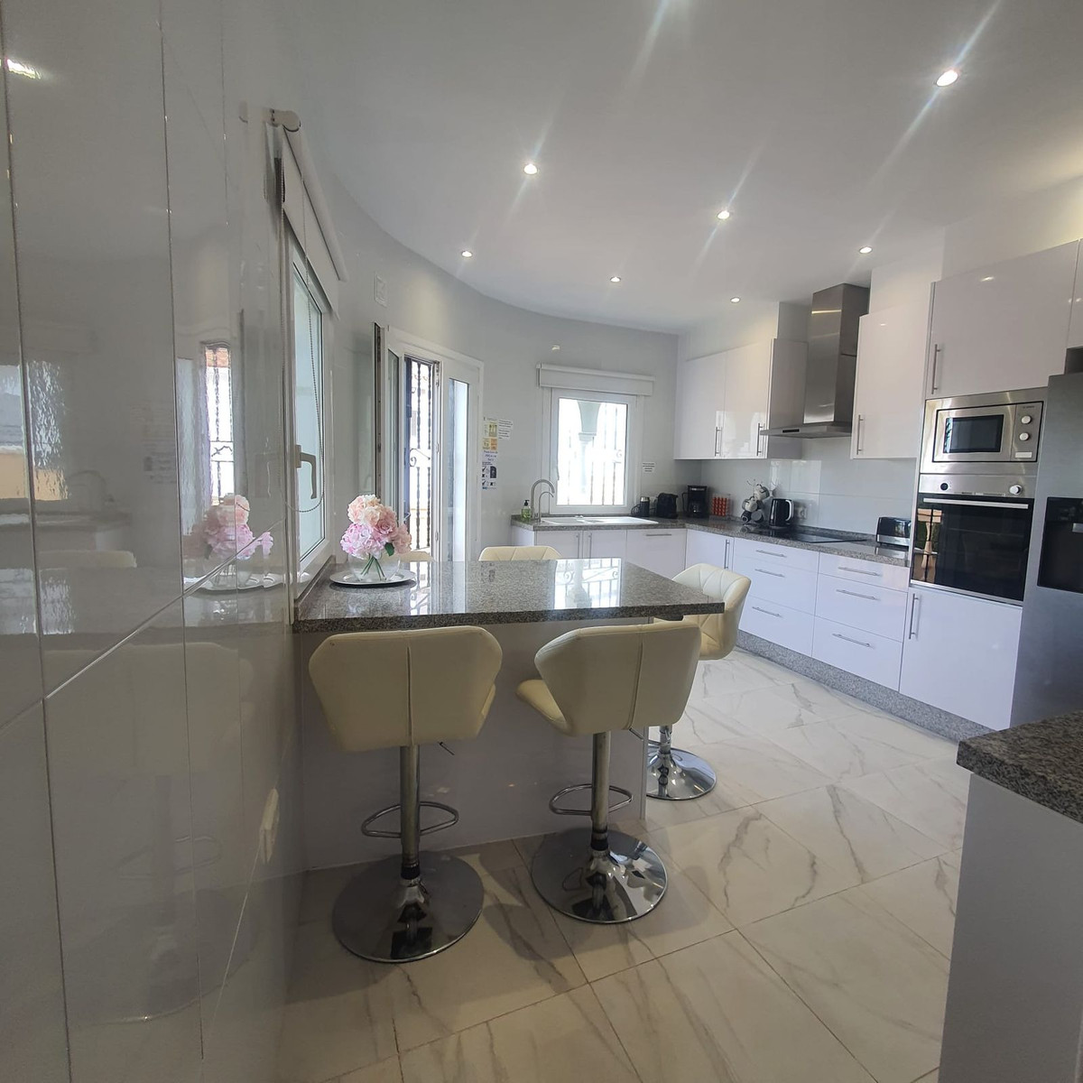 Fantastic returns from this large Villa which has a tourist license and a successful holiday rental business. Own a spacious six bedroom villa in a sought after urbanization close to beaches, a children's play area and shops and restaurants of Playa Marina. It features a large swimming pool, ample outdoor spaces with a well-established garden and low maintenance artificial grass. The main living area opens onto a covered terrace with glass curtains for year-round enjoyment and views of the pool. Inside, there are two open kitchen areas and a large roof terrace to enjoy the sun all day long.