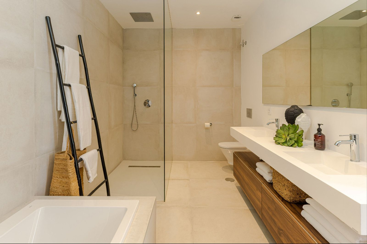 Med en sammanlagd byggstorlek på 476 m2 består dessa två fastigheter av många lounger, två fullt utrustade moderna kök med öppen planlösning, två gästbadrum och två stora tvättstugor. Alla nio sovrum (tre i en fastighet och sex i den andra) har gott om inbyggda garderobsutrymmen och eget badrum med golvvärme. Nio av badrummen har duschkabin, handfat och toalett och 1 badrum har badkar och dusch. De flesta av sovrummen har en halvprivat uteplats och är även utrustade med en platt-TV.