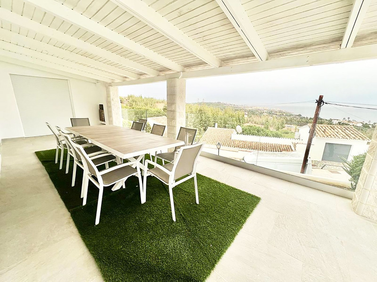 Huvudbostaden innehåller dessutom tre rymliga sovrum och två badrum, varav ett är en suite. Alla sovrum har vacker havsutsikt och direkt tillgång till en stor gemensam terrass – perfekt för morgonkaffet eller en solnedgång.