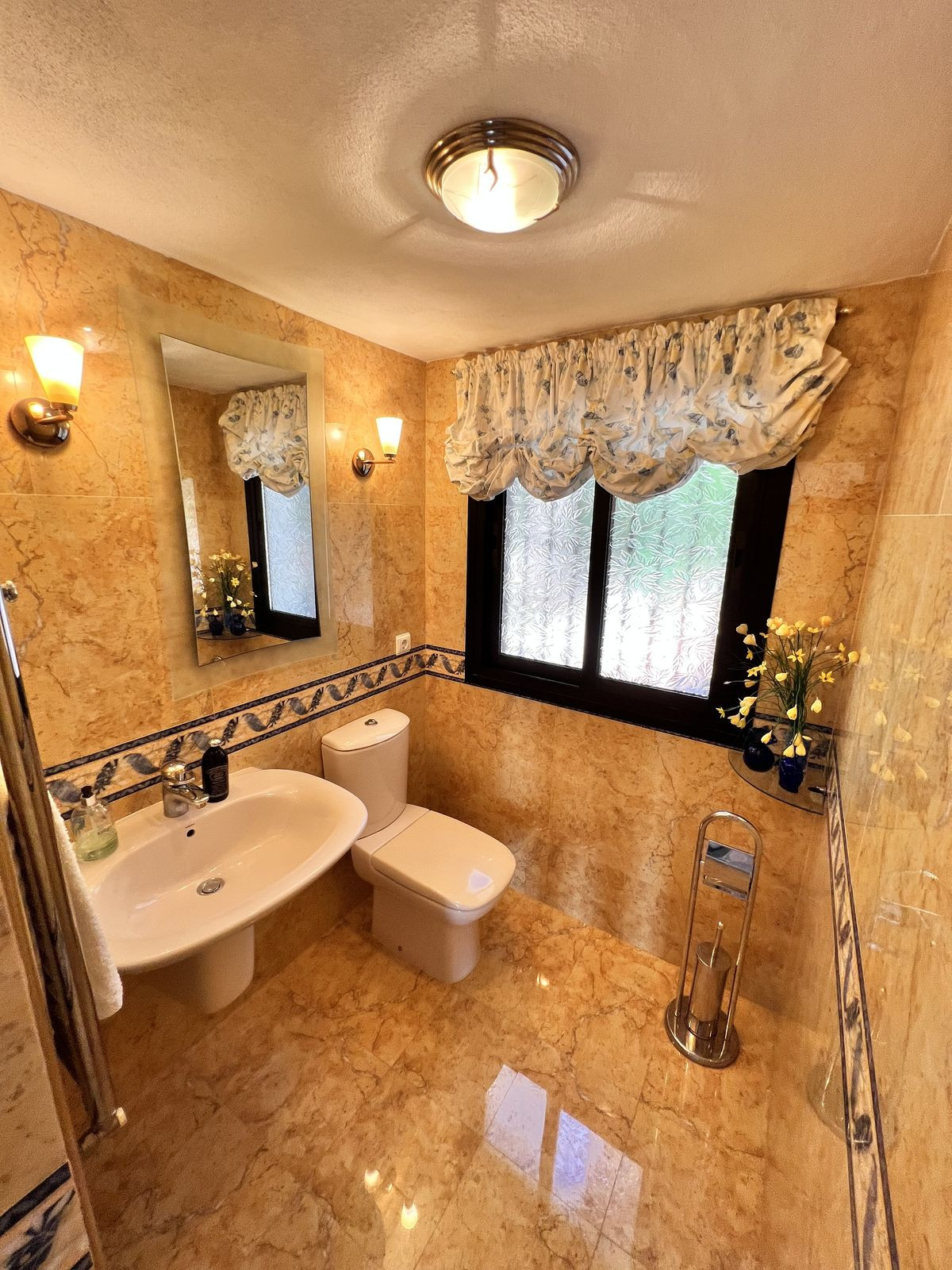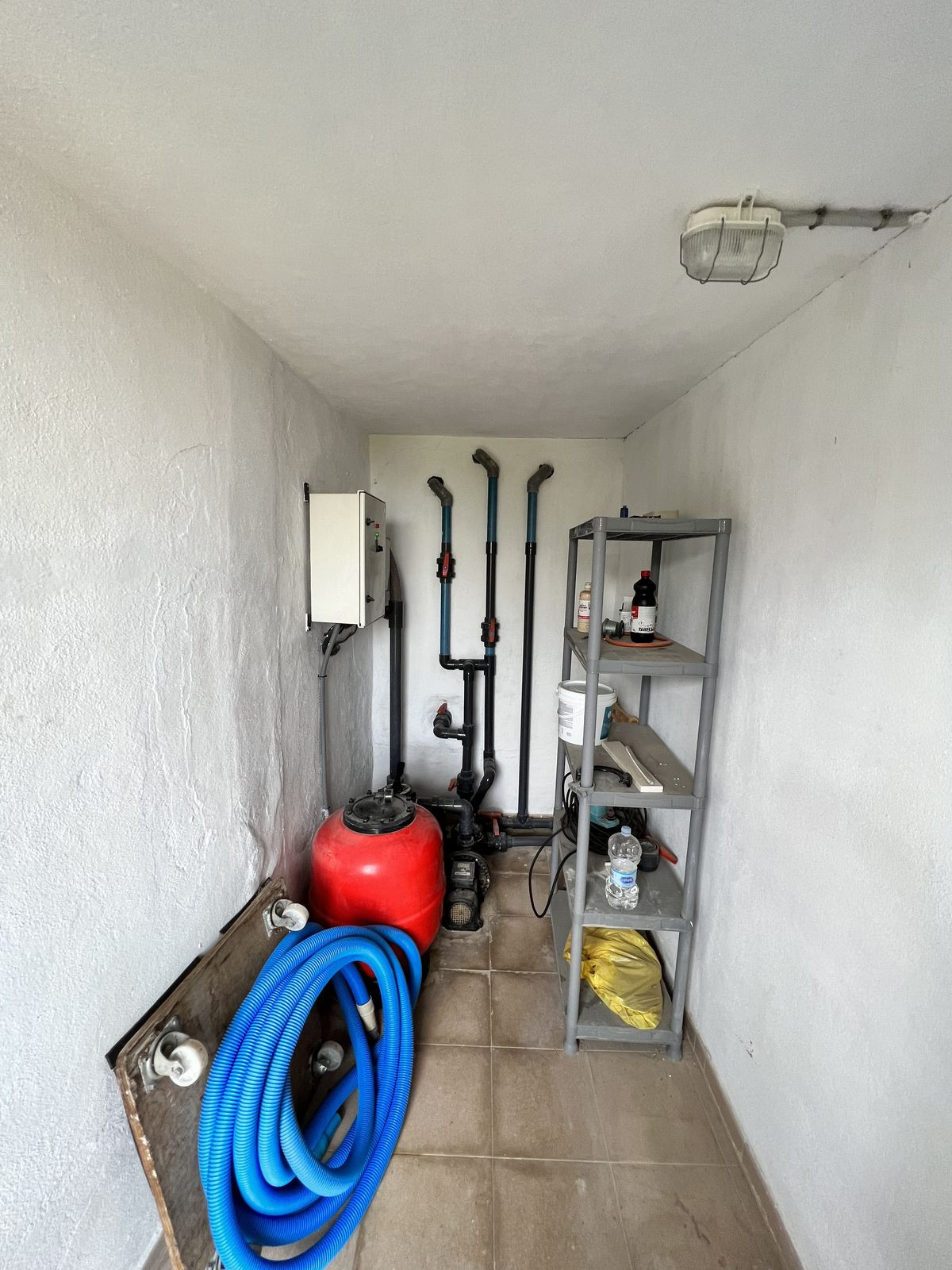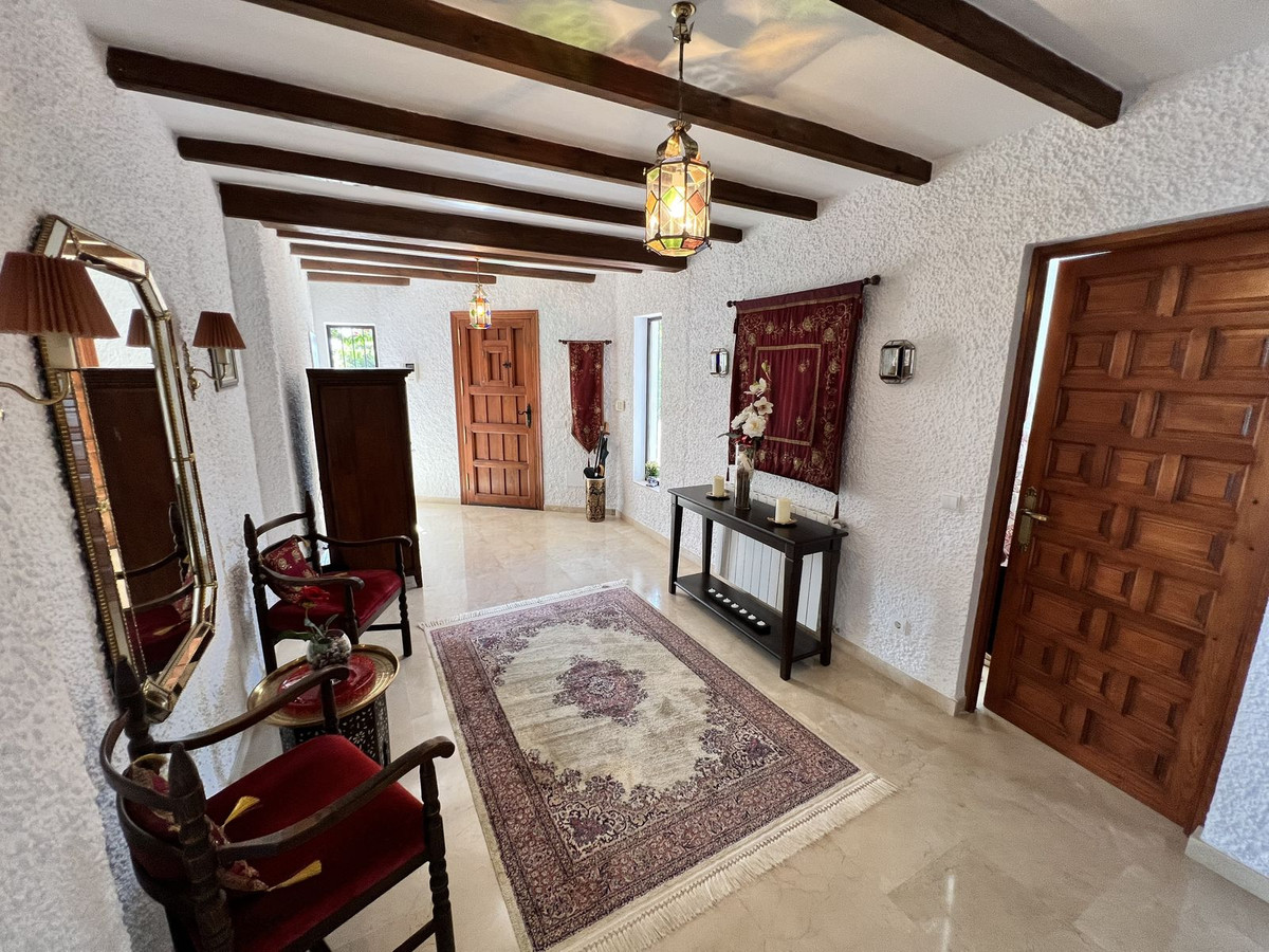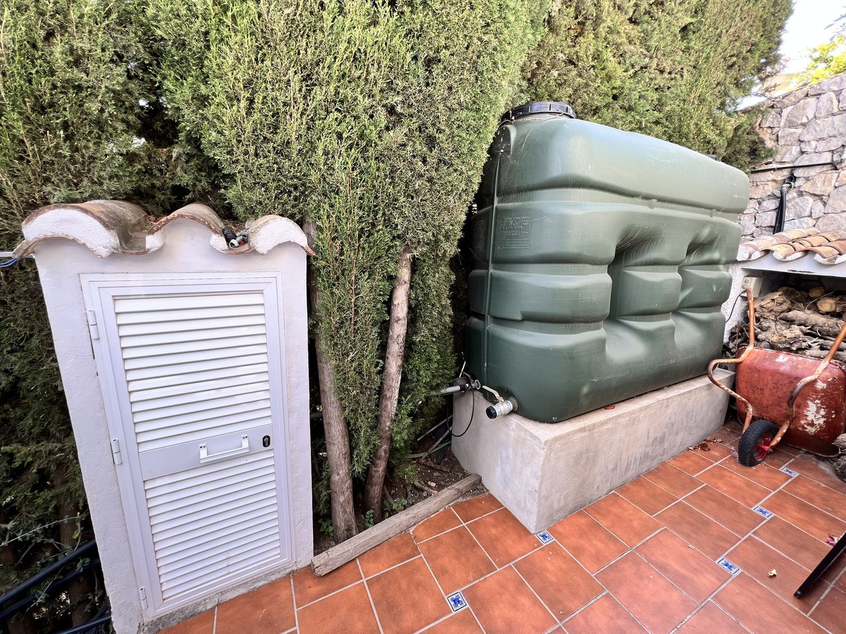 På baksidan av köket, via stalldörrar, finns tillgång till en härlig och rymlig innergård med kaktusträdgård, en stor kaklad väggmålning samt ytterligare förvaring och tillgång till garaget. När du återvänder till villan finns det ett master bedroom med anpassade möbler, ett klädkammare och ett eget badrum. Det finns även tillgång till terrassen. Utanför matsalen finns en härlig täckt terrass med fantastisk utsikt, inklusive inbyggda sittplatser med ett bord med marmorskiva och trappsteg som leder till trädgården och poolen. Från denna terrass går en hiss med direkt tillgång till nivån under.