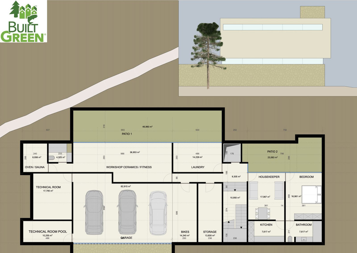 Källare: hiss, garage för 3 bilar och motorcyklar, bastu, gästtoalett, 2 tekniska rum, gym/verkstadsrum, förråd, tvättstuga, hall med trappa, hushållsavdelning med pentry och ett dubbelrum med eget badrum, 2 uteplatser.