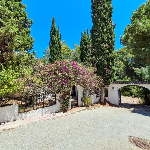 This villa is in a prime location in Calahonda, Mijas Costa, just 20 minutes from Marbella city center and just 30 minutes from Málaga city and the airport. Only 5minutes from the beach. Directly adjacent to a green zone, you can enjoy the unobstructed view of the sea and the African coast. The villa, built in a modern Andalusian style, is located on a plot with a total of 4,162m2 and has a built area of 771m2. The well-kept Mediterranean garden with old cork oaks and a small pine grove as well as a spacious private pool offers varied opportunities for leisure activities on different levels. A special property in a perfect and very private location!