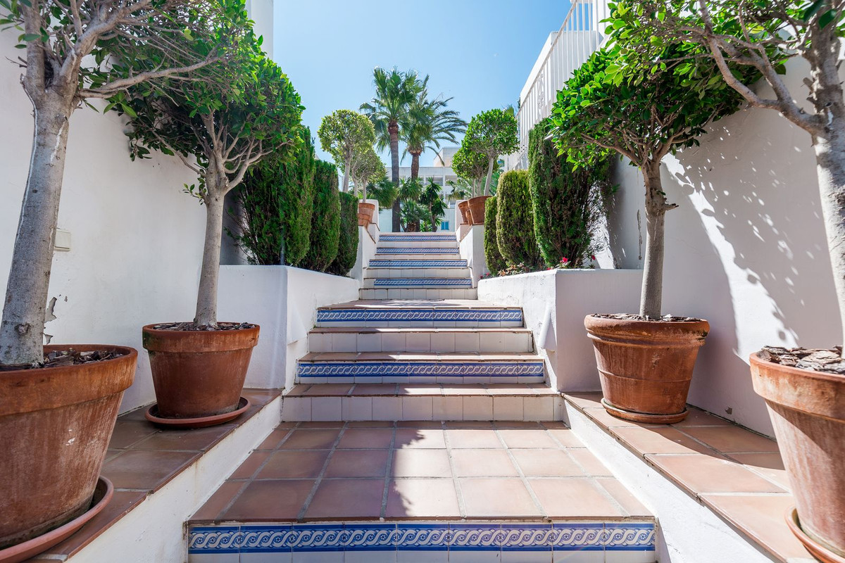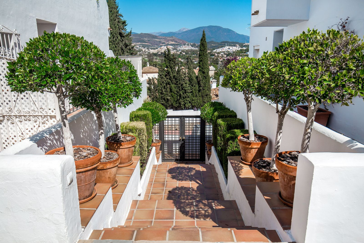 Mycket stor terrass i västerläge med utsikt över bergen, gated community, gemensam pool och välskötta trädgårdar. Privat parkering.