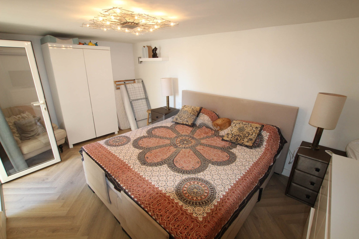 The apartment has its own entrance, a combined living/dining room, kitchen, bedroom, and bathroom.
