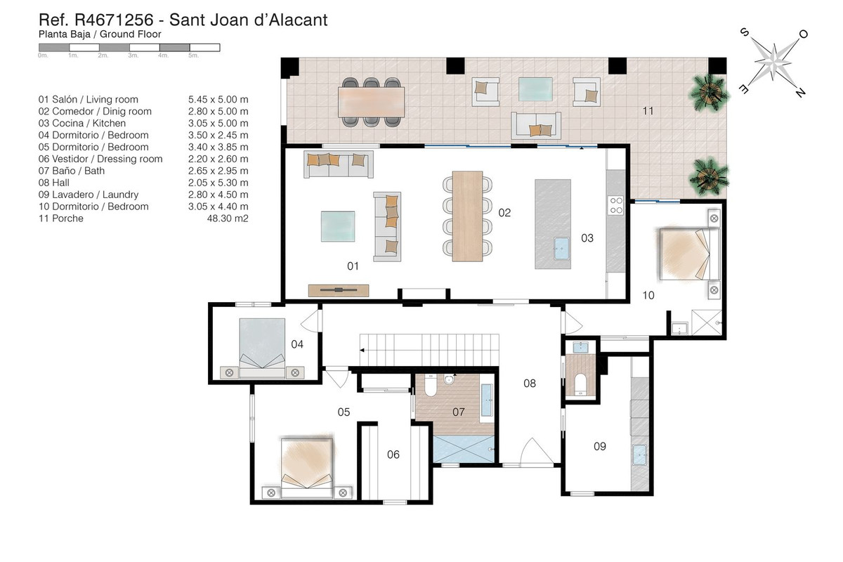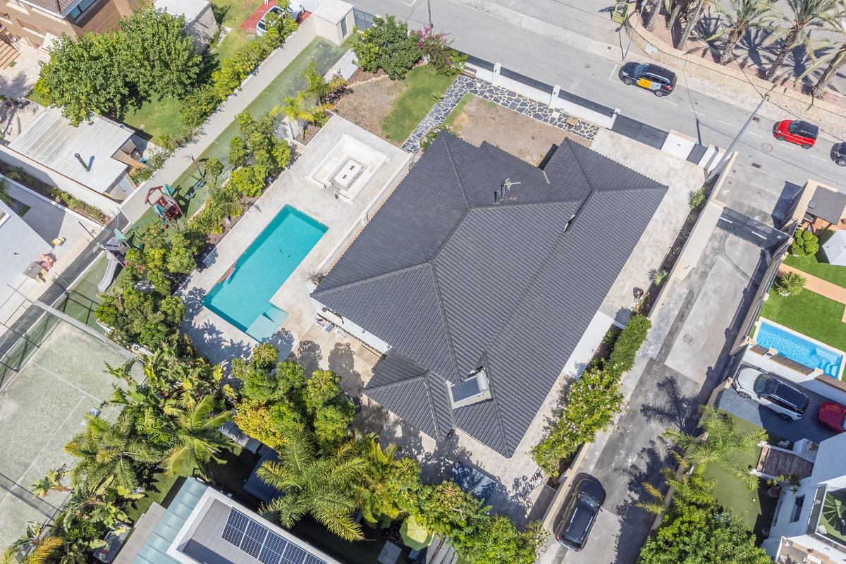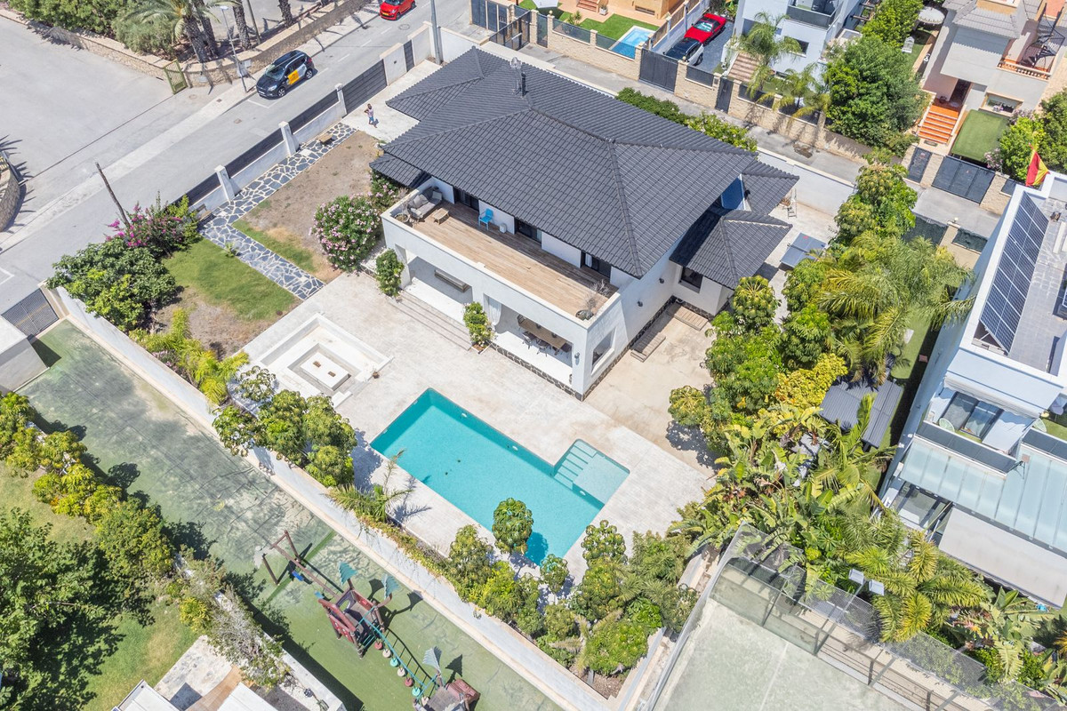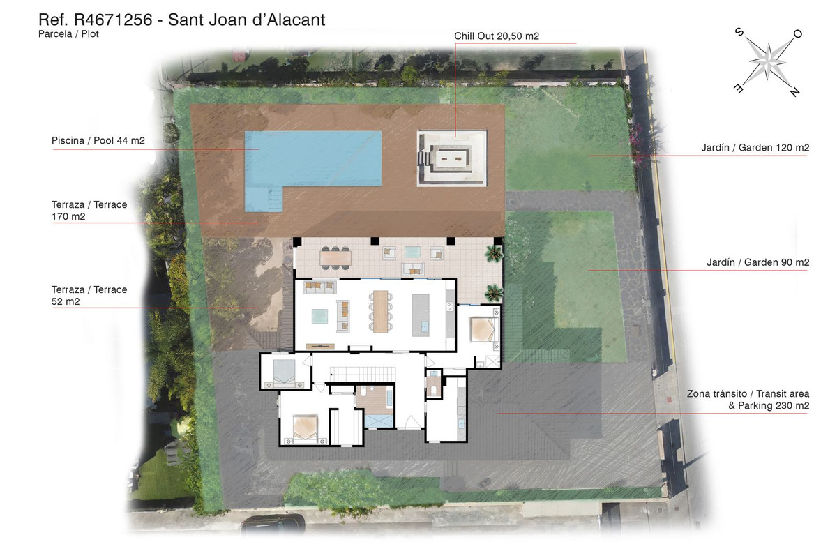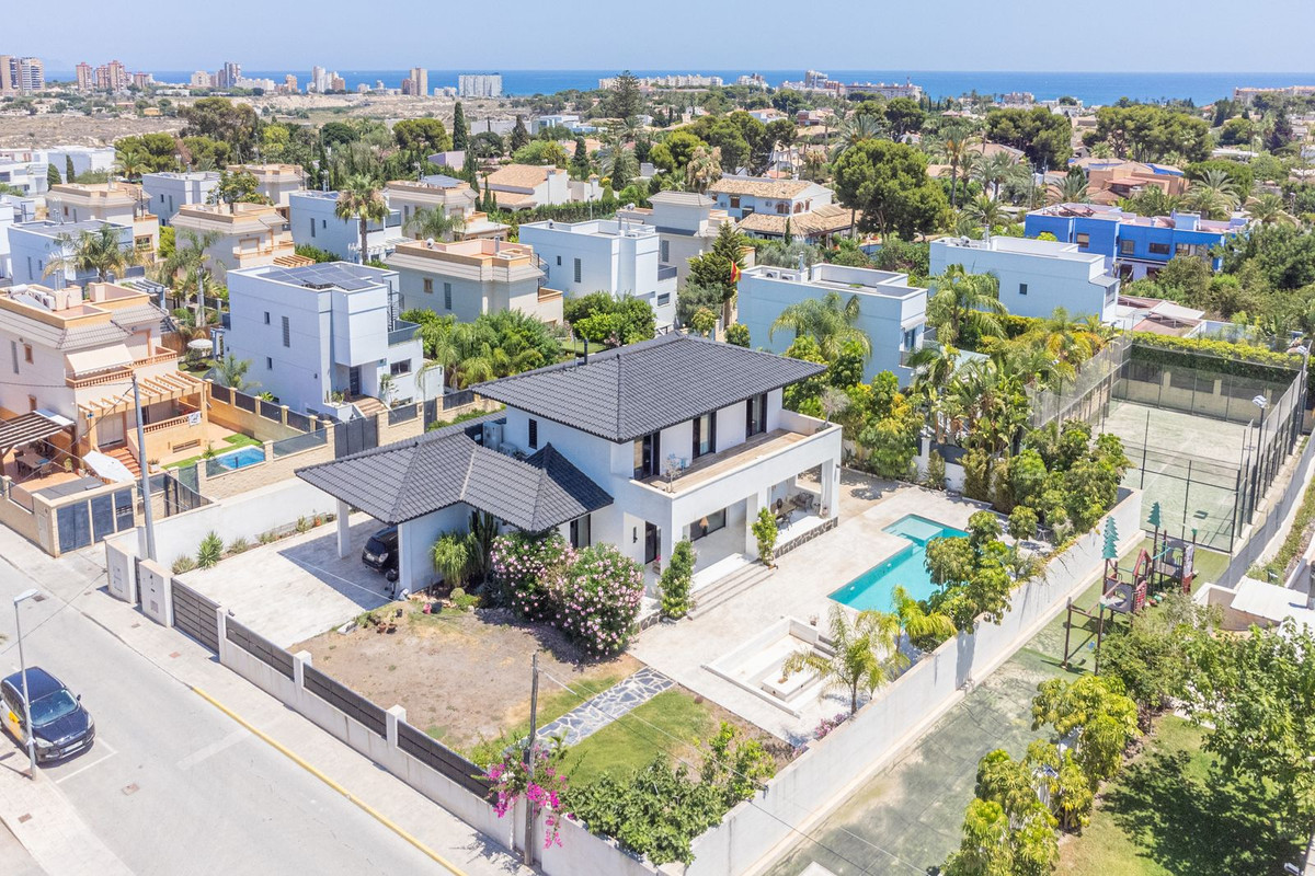 Located in the sought-after residential area of La Font, perfectly situated between the stunning Muchavista Beach and with easy access to the highway to Alicante, this modern luxury villa offers an exceptional lifestyle. Built on a completely flat, rectangular, and private plot—almost three times the size of the house—this impressive 360 m² residence stands out for both its design and surroundings.