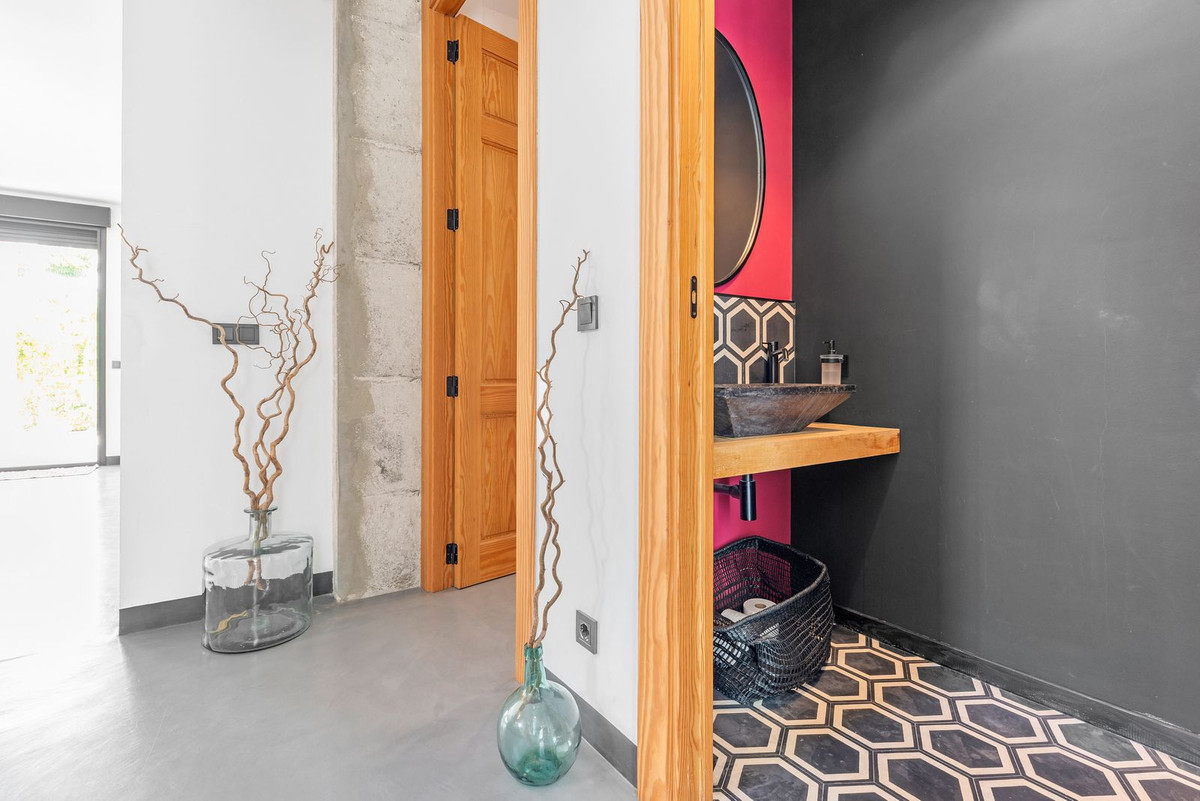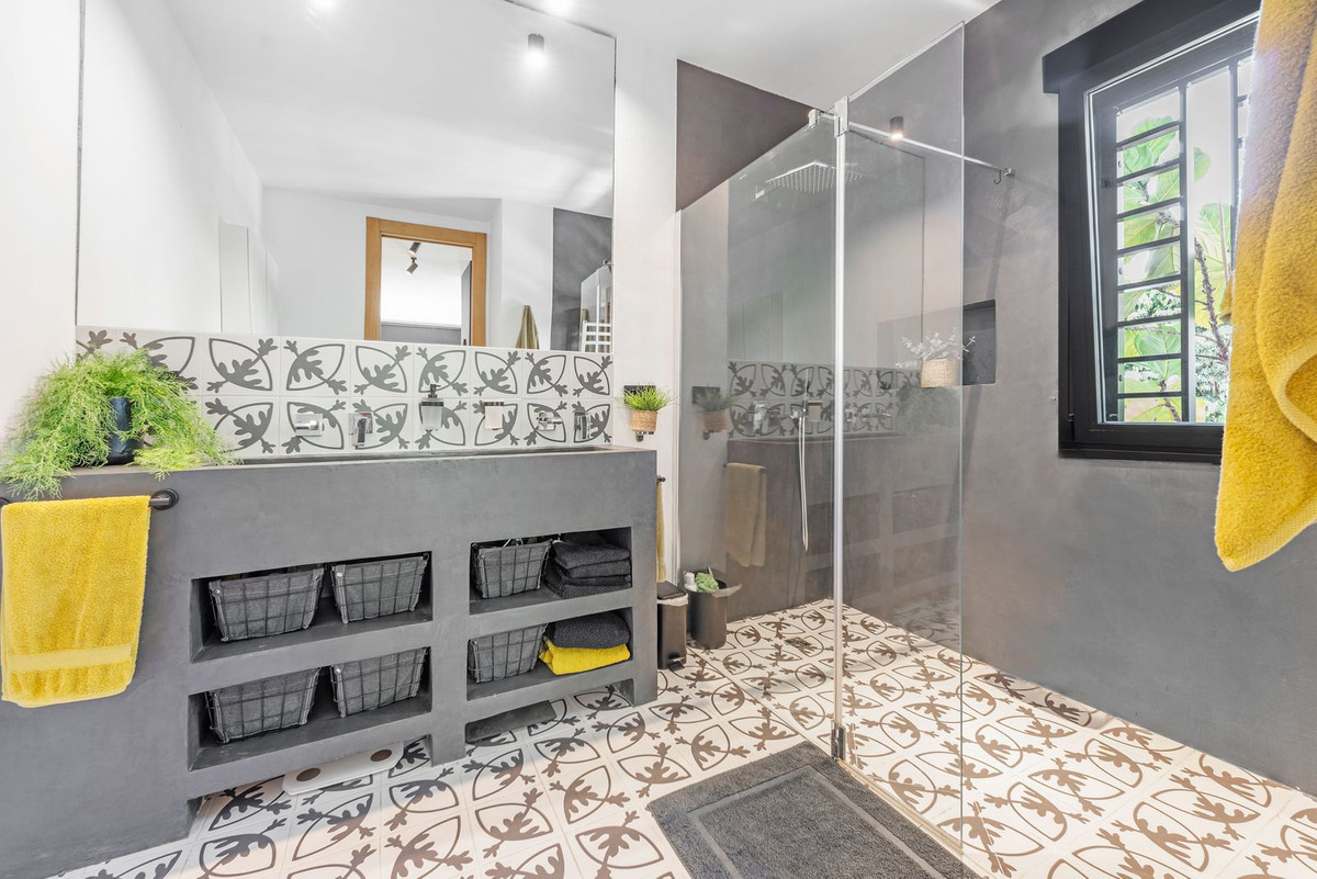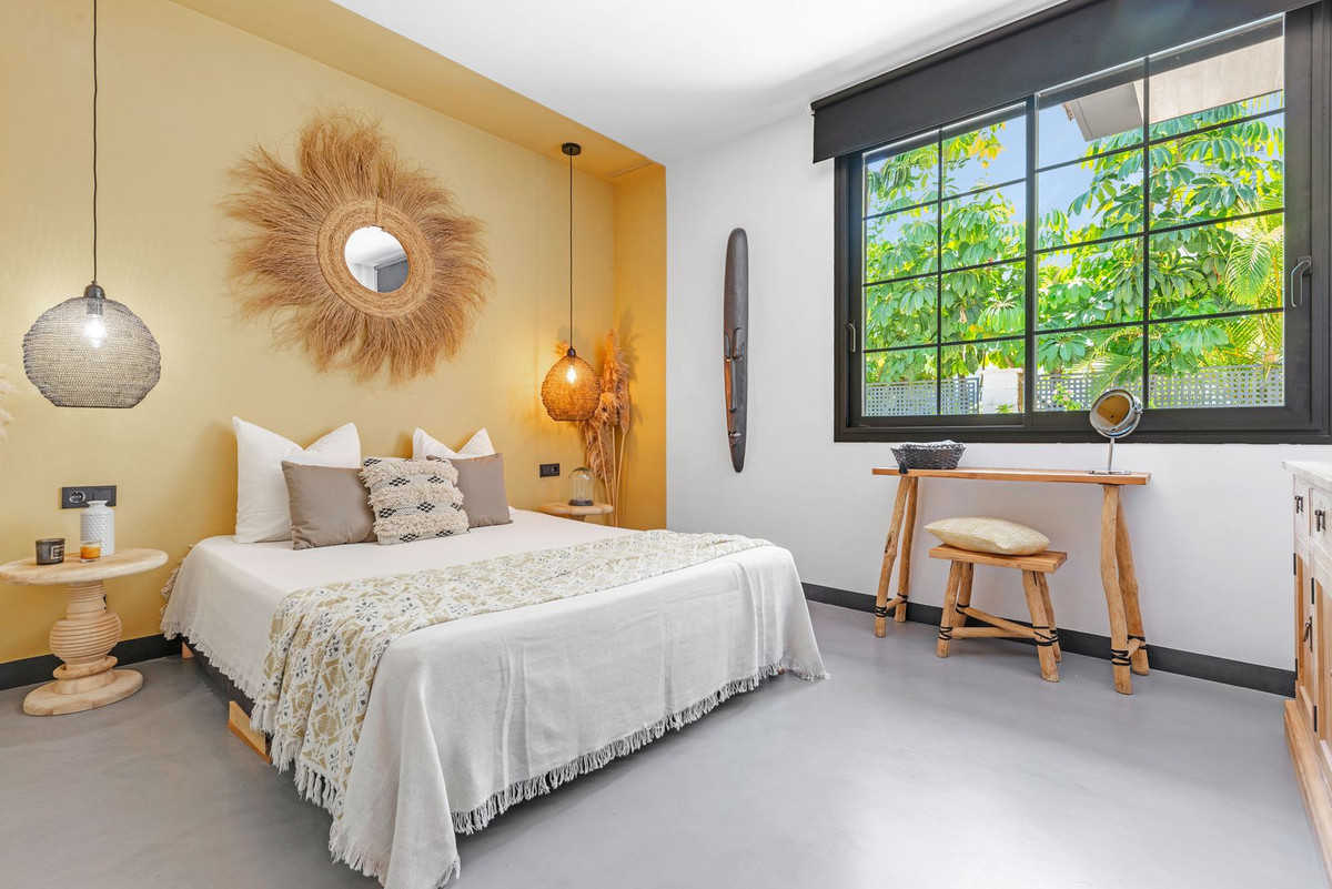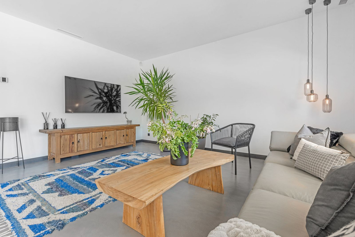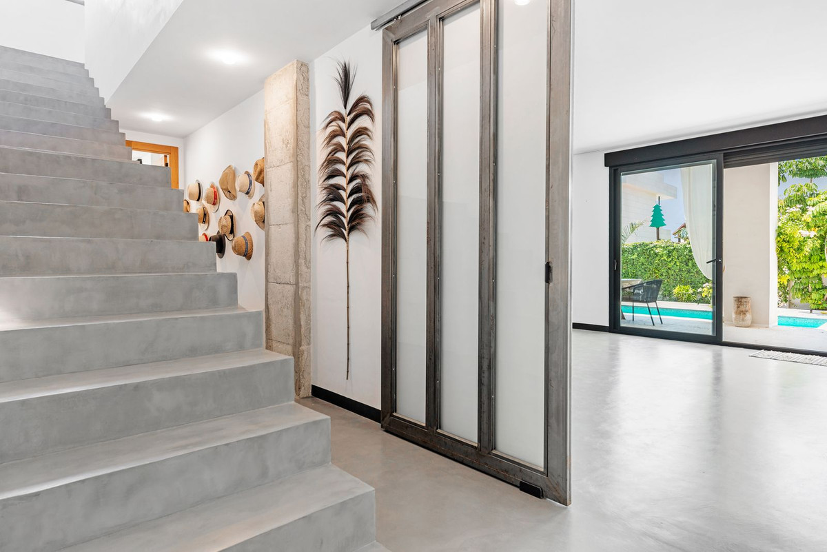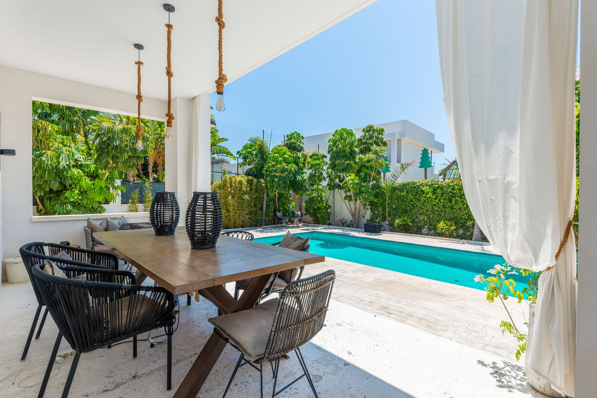 This space, along with one of the bedrooms, opens onto a generous covered terrace overlooking the pool, outdoor dining area, and garden.