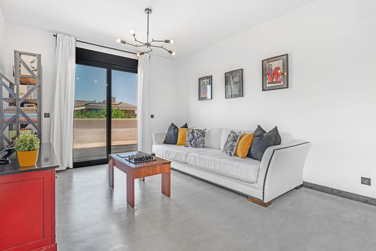 Lounge area with direct access to a 32 m² wooden-decked terrace offering panoramic views of the surroundings.