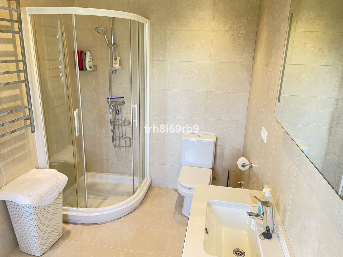 In addition to the lounge, dining room and kitchen, the villa has 3 bedrooms on the ground floor, all of which have en-suite bathrooms and 2 of which have direct access to the pool area. There is also a large master bedroom with dressing area and en-suite bathroom with a bath and separate walk-in shower on the upper floor. The master bedroom boasts its own spacious private terrace, with ample space for sun loungers and a dining table and chairs, from which the views of the golf course and La Concha mountain are even more spectacular.