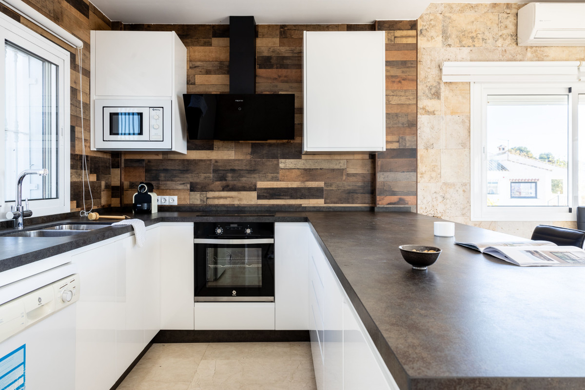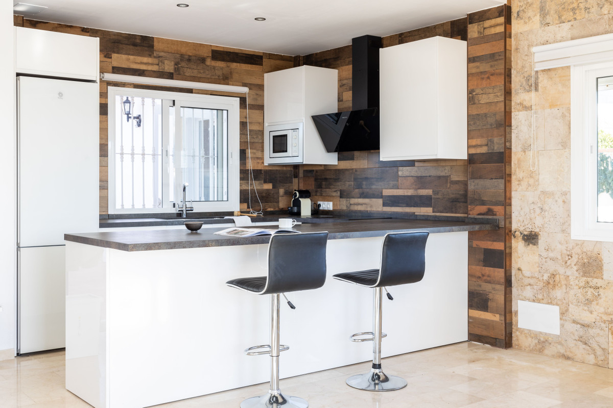 Downstairs there is another 54m2 room and a kitchen, which can be used to make a separate apartamento. On the same level is the garden and swimming pool area, which also has a view of the Mediterranean Sea.