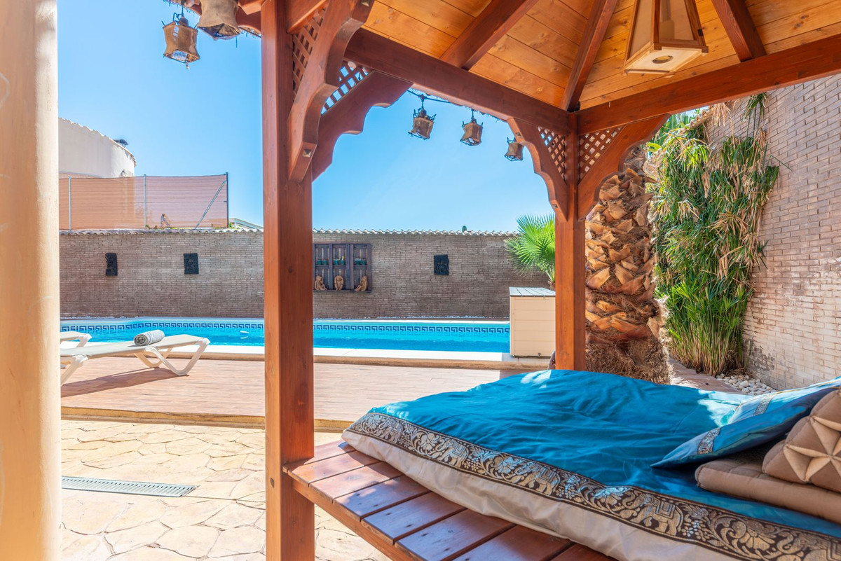 Located in the sought-after area of Partida Bonalba, Busot, between the golf course and the charming village of Busot, is this remarkable residence: Villa Bali. Renovated to a high standard, it offers over 330 m² of living space. Situated on a private plot more than double its size, this villa enjoys easy access to the village of Busot, just a five-minute drive away, 15 minutes from the pristine beaches of El Campello-San Juan, and only 25-30 minutes from Alicante and its international airport.