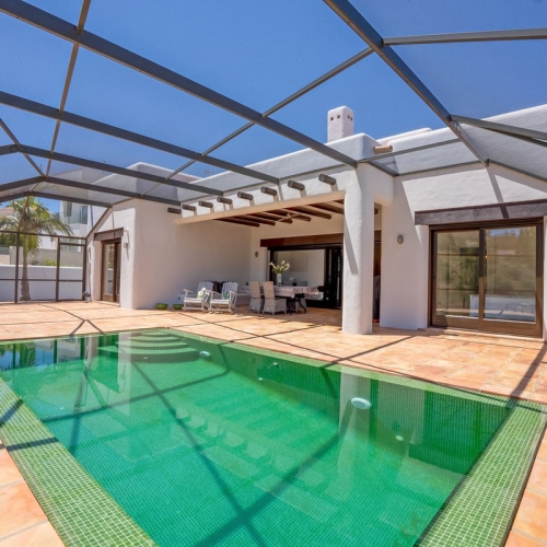 Set on a privileged golf front position in a quiet cul-de-sac street in the very heart of la Cala Golf resort, this superb detached villa enjoys sun all day and stunning golf views. Built in 2017 with a contemporary look, the villa benefits from great quality specifications, modern and open plan layout and the best possible natural light. The villa offers expansive open and covered terrace areas, as well as spacious indoor living space including 4 bedrooms and 3 bathrooms, a modern kitchen and laundryroom with Siemens appliances and living- dining area that offers an open plan concept. The living area and kitchen access directly to the sunny terrace overlooking the golf and to the superb swimming pool, which is the perfect spot to enjoy the true Costa de Sol outdoor living style.
