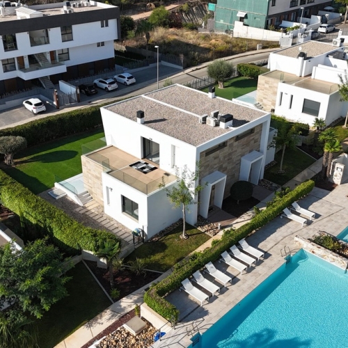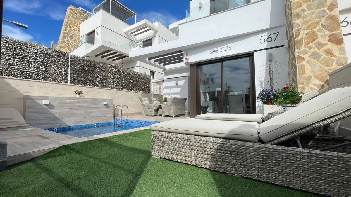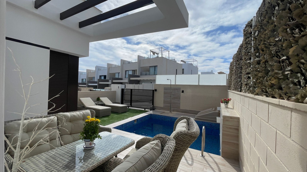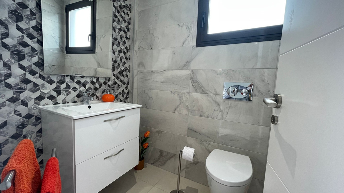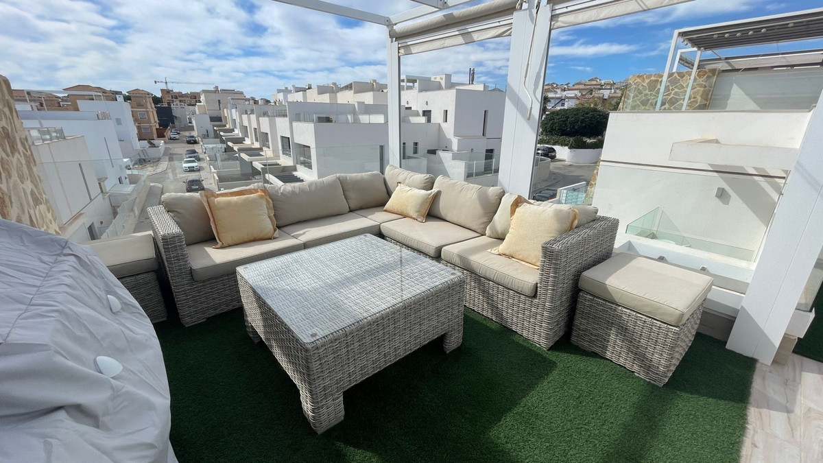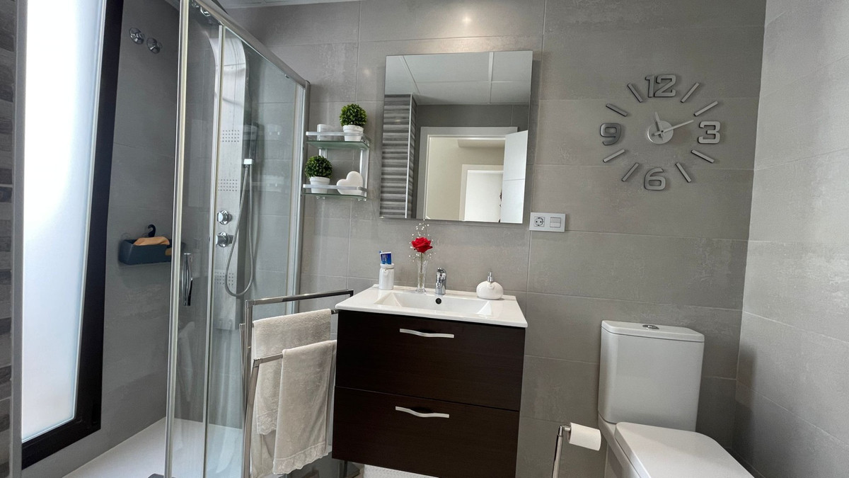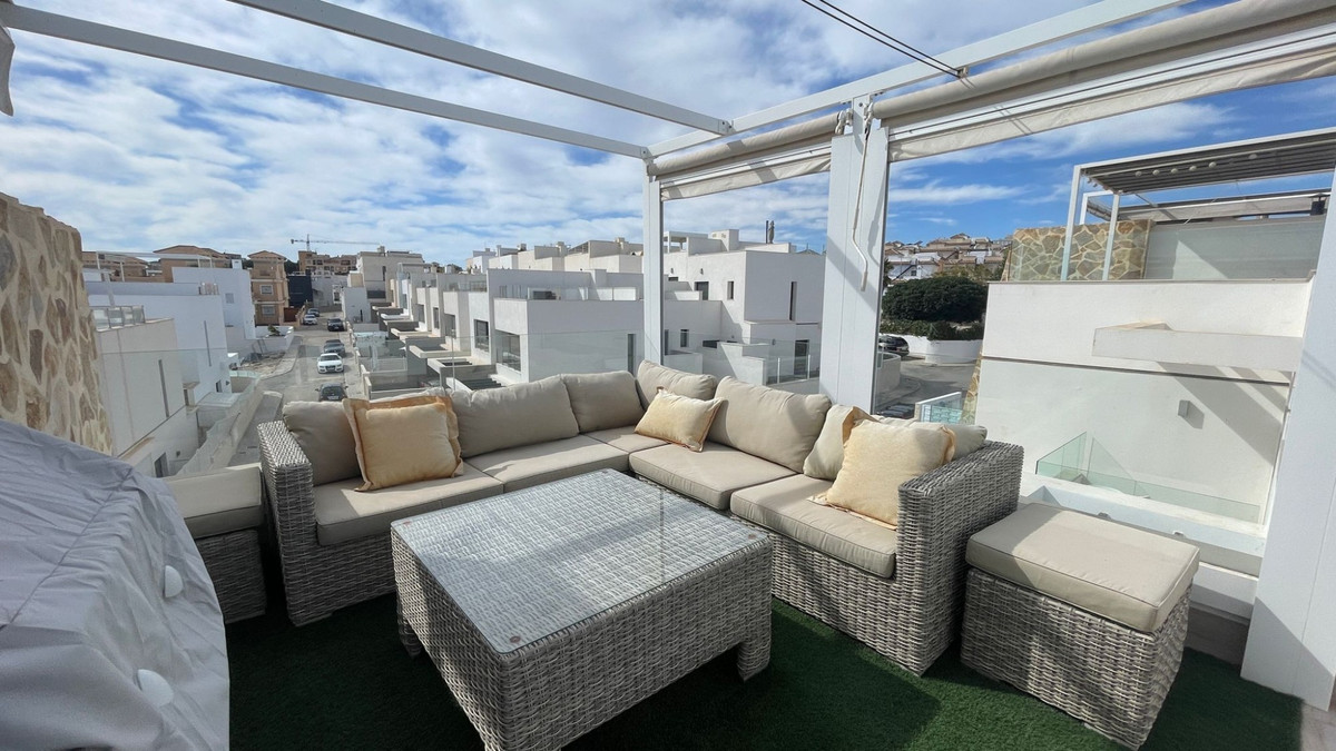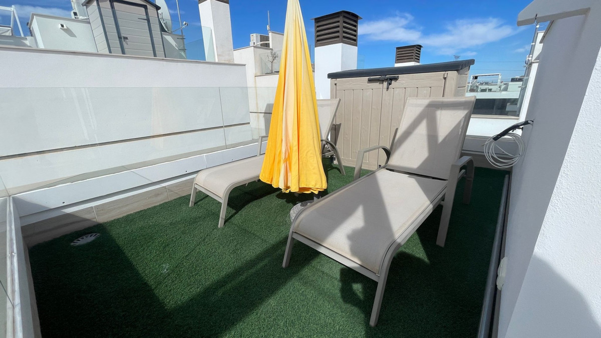 The property itself comprises a modern living and dining room with adjacent fully equipped open-plan kitchen and a separate toilet. On the first floor there are 2 more lovely bedrooms with terrace and a bathroom. There is also a solarium where you can relax with a drink in the Spanish sun.