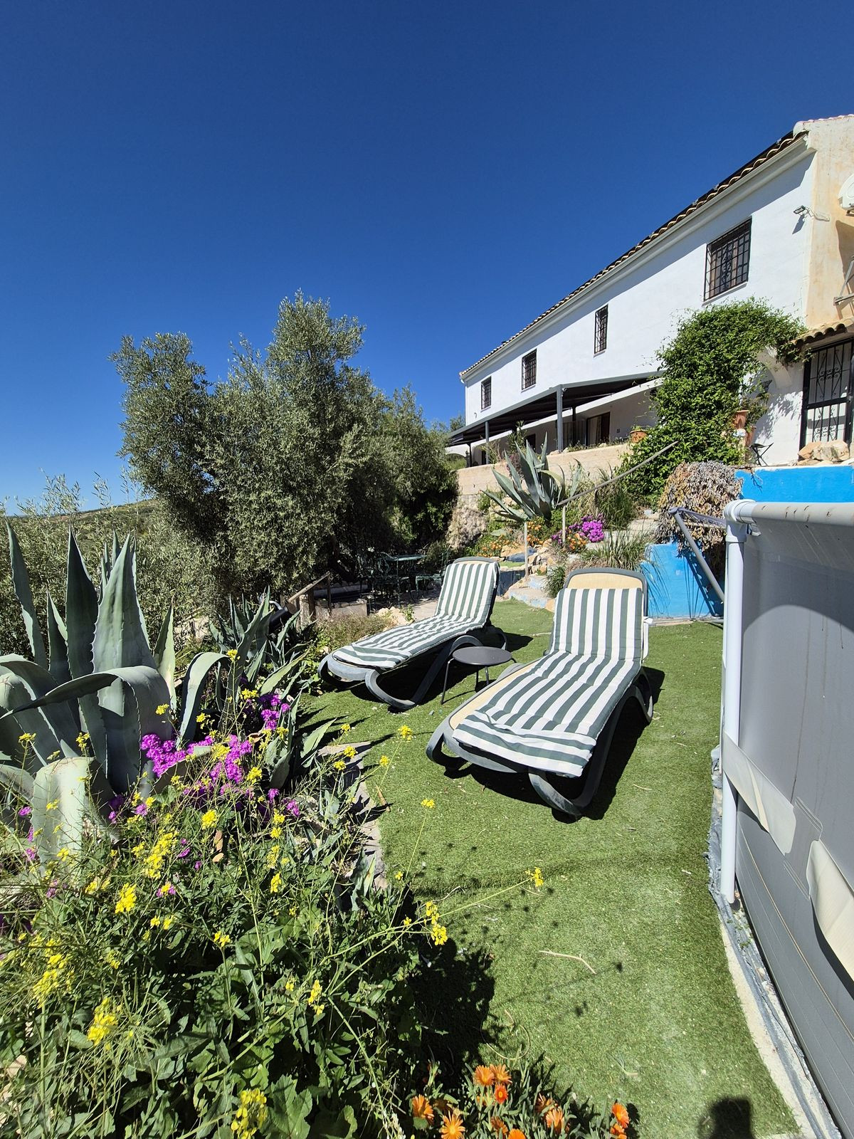 Huset är omgivet av en vacker trädgård med egen odling av frukt och grönsaker, här finns även en pool och bowl-bana. Du har allt för att själv kunna trivas och även kunna underhålla dina gäster. Från de omgivande 400 olivträden, har du möjlighet att producera din egen speciella extra jungfru olivolja. Med dagens pris på olivolja, har du möjlighet att göra en riktigt god affär.