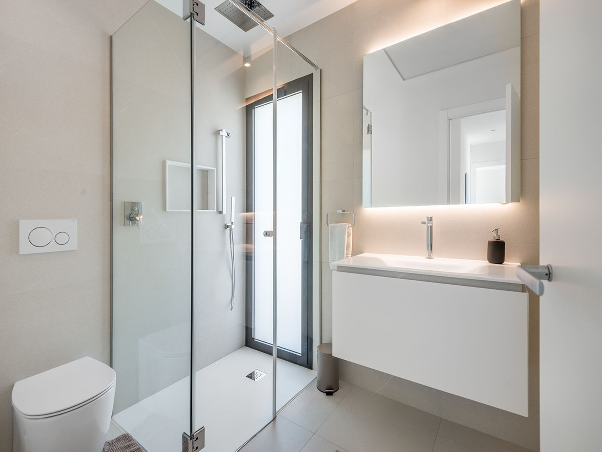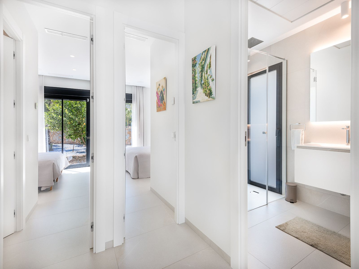 The open kitchen merges into the living and dining area, on this floor there are also three bedrooms with en-suite bathrooms and an exit to the garden. The bedrooms are located in their own wing, guaranteeing peace and quiet. There is under floor heating throughout the main floor.