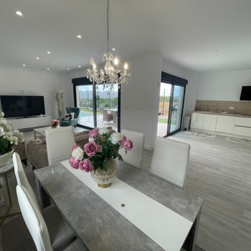 Big luxury villa for sale in La Fustera, situated just 1,3 Km from the beautiful La Fustera Beach, supermarket, restaurants, bus stop..., very close to Moraira and Calpe. This wonderful modern mediterranean style villa enjoys very nice sea views, plenty of sun (South facing) and maximum privacy. It is located on a superb plot of 1.840 m2 and has a constructed area of 585 m2, distributed over two floors + basement floor as follows: on the main floor we have the entrance porch, a fabulous 25 m2 hall with a beautiful double staircase that accesses the upper floor, an indoor spa and relaxation area with a 6x3 meters heated pool + jacuzzi + waterfall, sauna for 6 people, 25 m2 gym and 1 toilet, large 15 m2 laundry pantry, 30 m2 dining kitchen with island, fabulous dining living room of 75 m2 (with designer fireplace), and 50 m2 porch (perfectly equipped with a summer kitchen), which merges with the 100 m2 exterior terrace where we have a wonderful 70 m2 heated pool. Integrated into the garden, we also have a barbecue area that communicates with the exterior terrace. On the upper floor we have 5 large bedrooms (25 m2 + 20 m2 + 18 m2 + 18 m2 + 12 m2), 4 bathrooms en suite, a dressing room and 2 private terraces (80 m2 + 25 m2). In the basement floor we have a party room (with bar) of 40 m2 (with natural light through an English patio), 1 courtesy toilet, guest apartment (also with access from the outside), consisting of 1 bathroom, 1 bedroom of 12 m2 and open plan kitchen dining living room of 25 m2. In addition, on this floor we have an open space of 110 m2 not developed that offers a multitude of expansion options for this property. This impressive villa stands out for its beautiful design, for its exclusive materials and for its top quality finishes. It is equipped with underfloor heating and air conditioning, high end exterior carpentry, designer interior carpentry, designer kitchen fully equipped with Smeg appliances, designer bathrooms, alarm + cameras, LED lighting... In addition, it enjoys large exterior parking areas for several vehicles and an impressive 50 m2 pergola (for 3 vehicles, which could easily be converted into a garage), located next to the main entrance of the property. The garden is spectacular, with large grass areas, beautiful palm trees and is low maintenance (with automatic irrigation system).