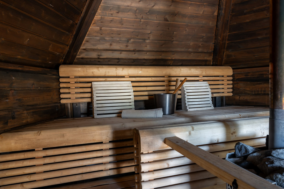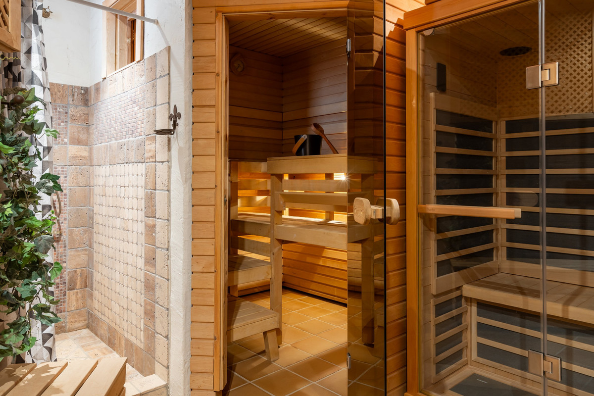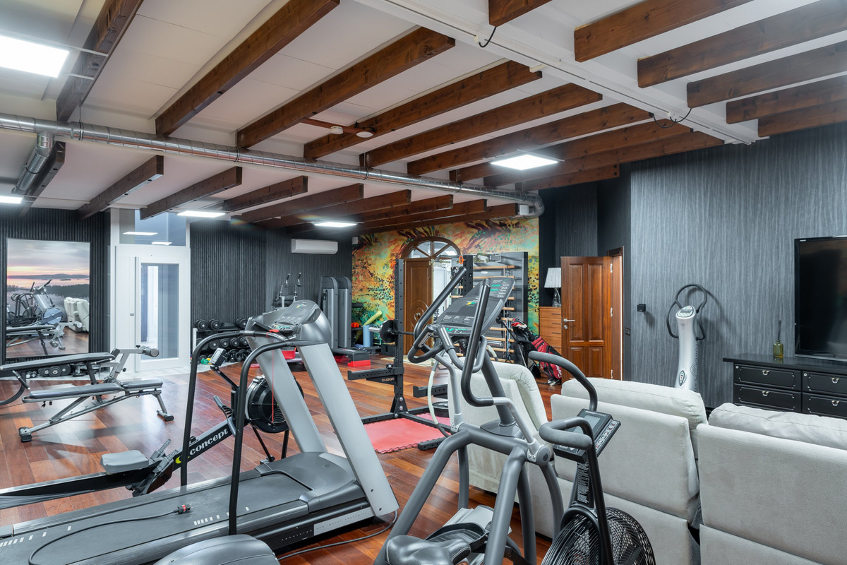 On the ground floor, there are four more bedrooms, each with a door leading straight to the garden and the pool. And there's a Finnish sauna near the pool for relaxation. Plus, there's a gym and a big garage. Down in the basement, there's a cool home theater, a place for massages, a traditional sauna plus an infrared sauna, and one more bedroom with its own bathroom.