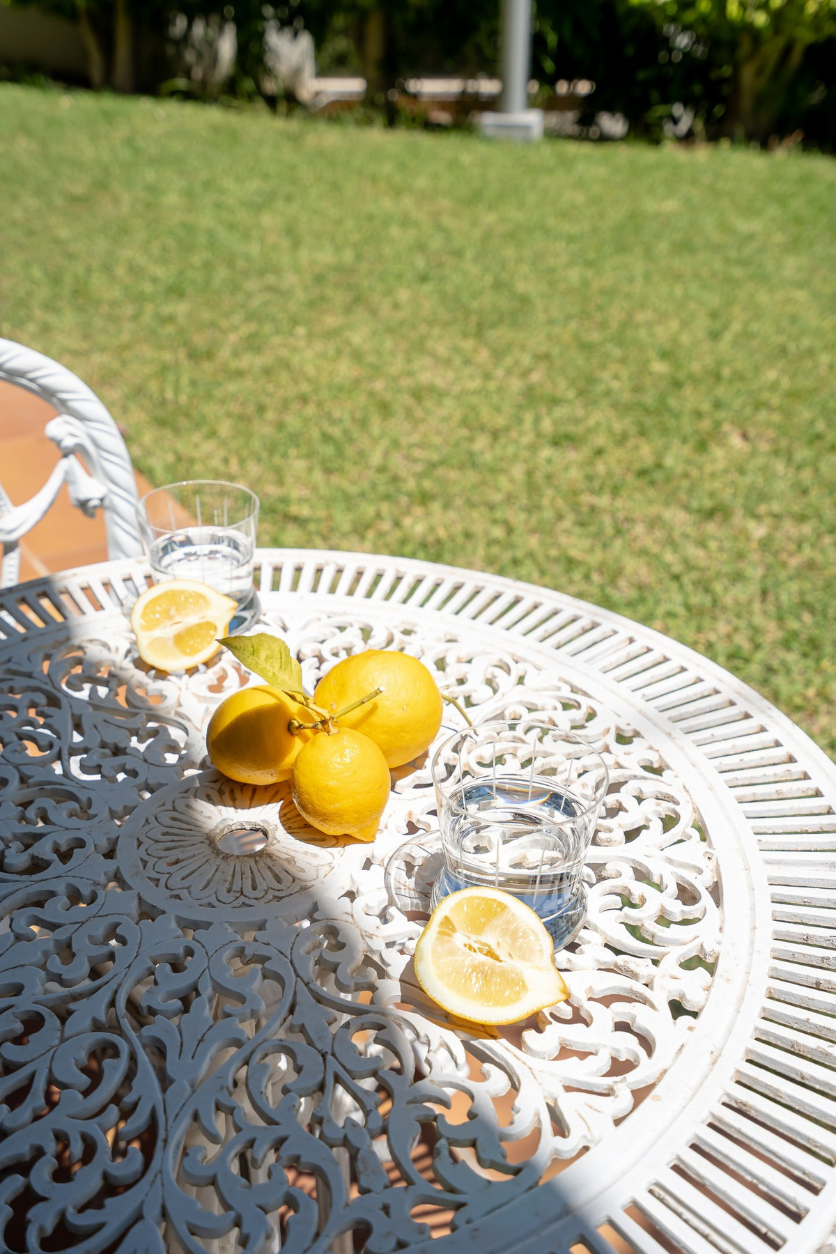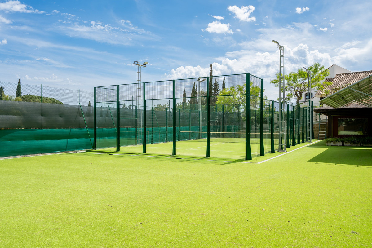 Outside, the garden faces south and has lots of paths to walk, a big play area, places to work out, and even a padel court.