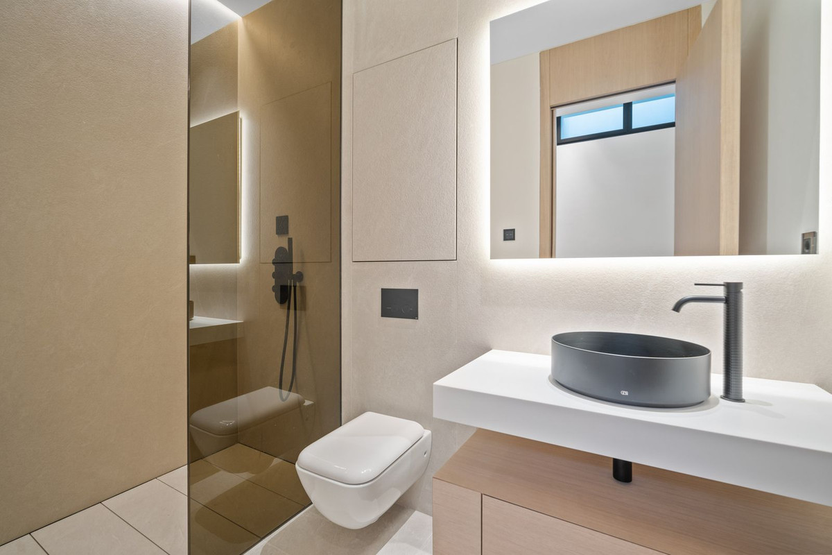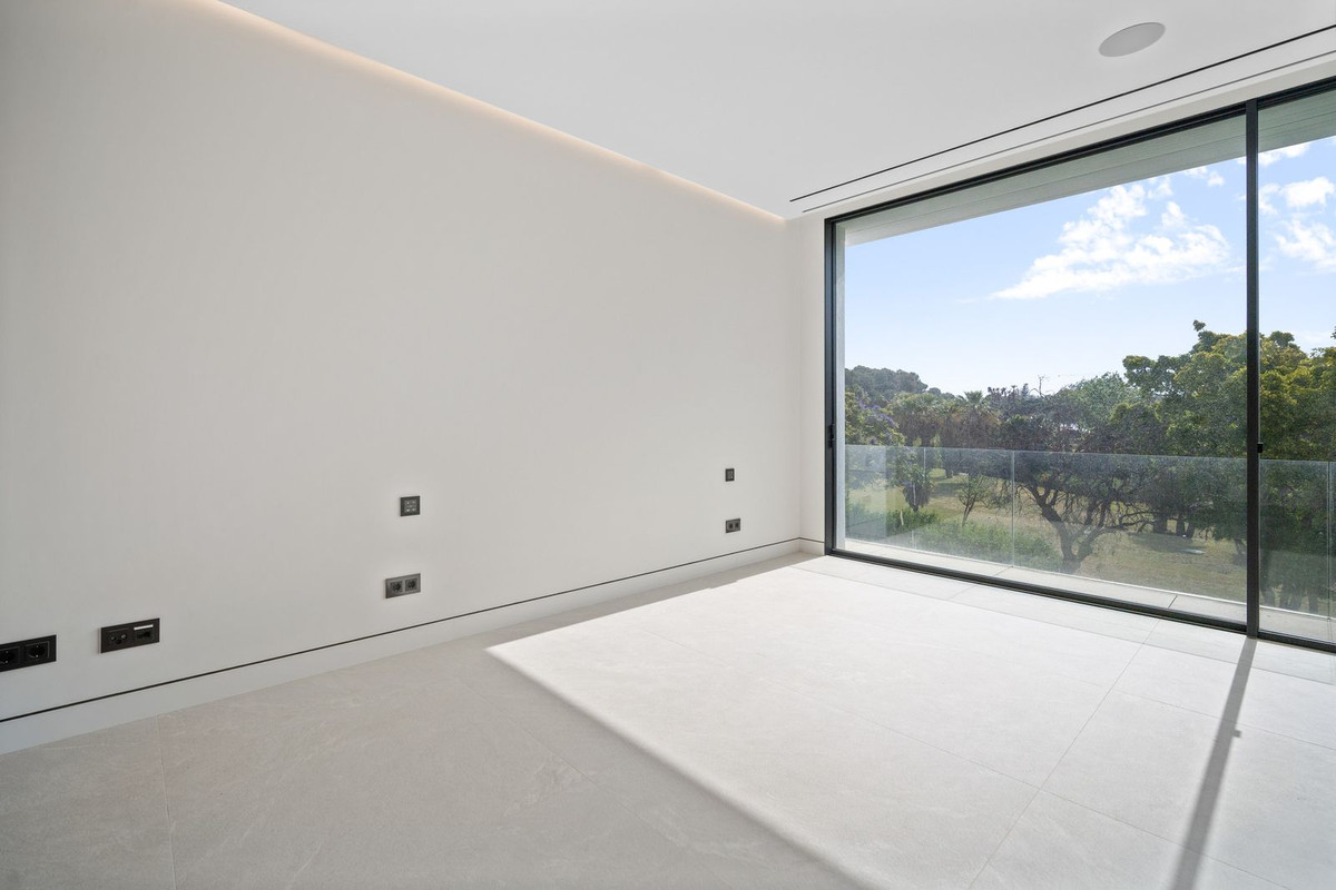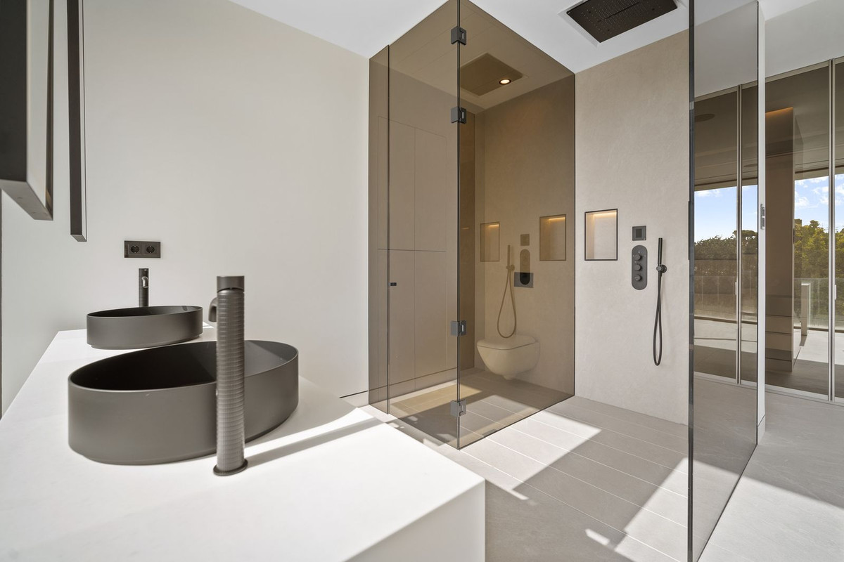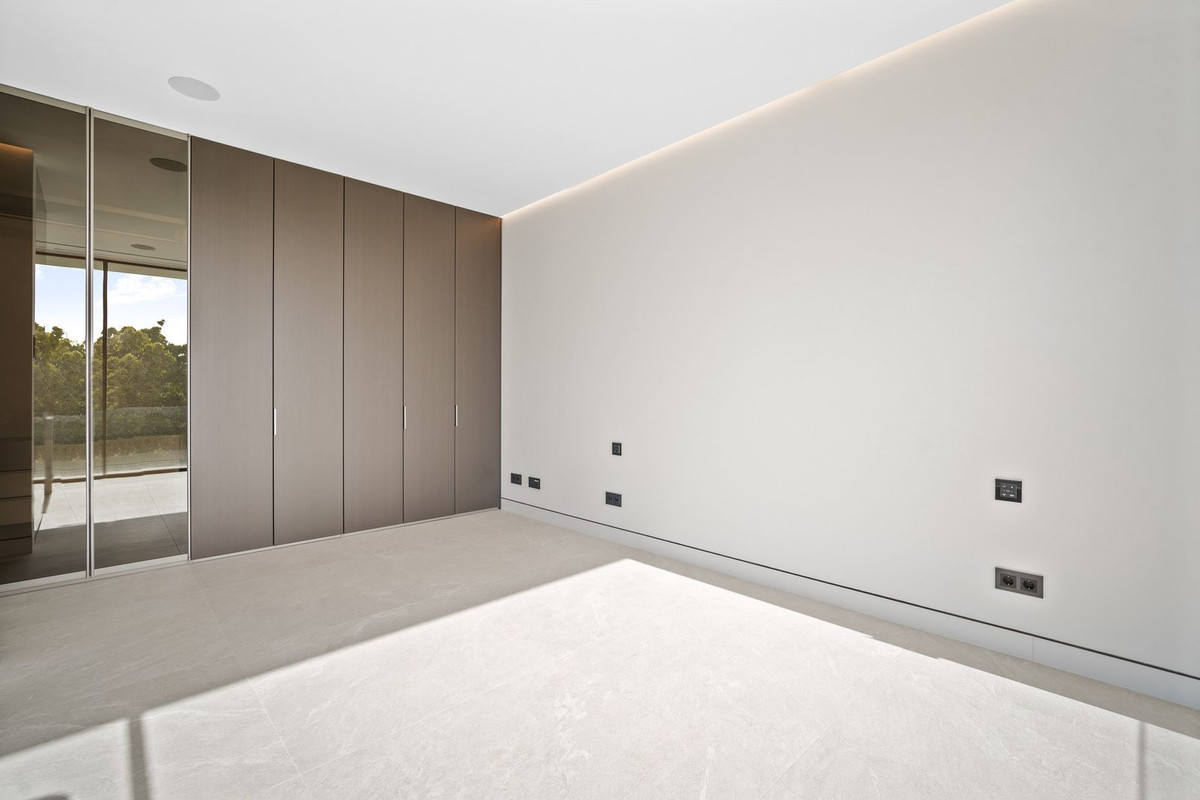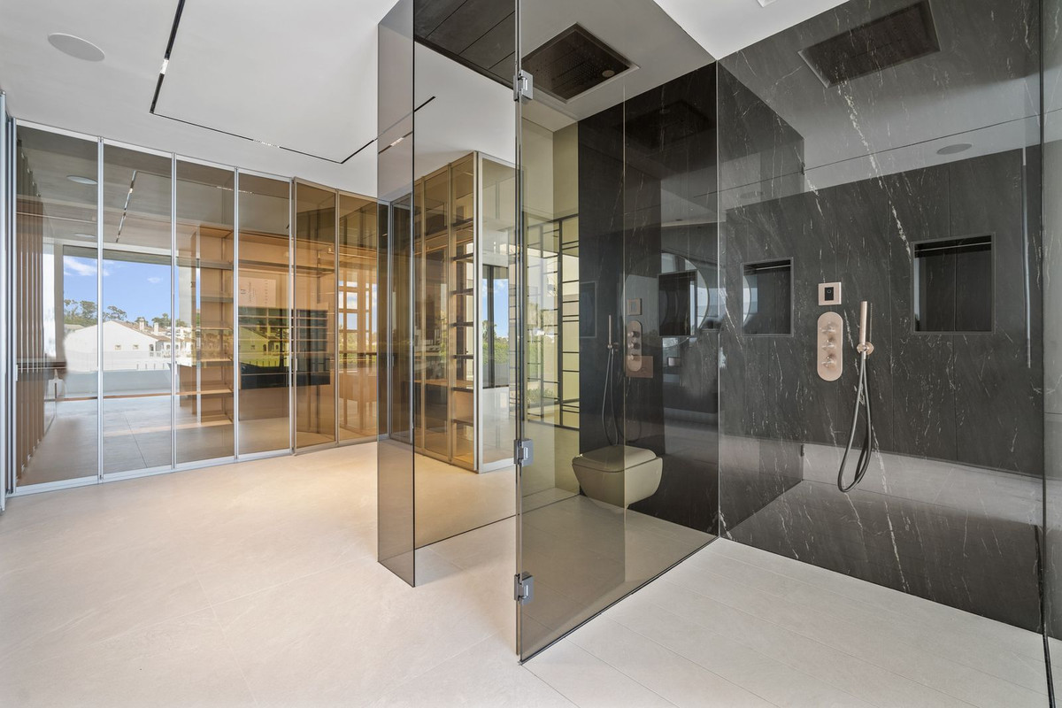 Den första våningen presenterar en sensationell Master bedroom-svit, med dubbelhöjda tak, klädkammare med glasfront och ett lyxigt badrum komplett med en stor dusch och ett fristående badkar som har utsikt över terrassen och Medelhavet utanför. Ytterligare två utsökt designade sovrumssviter pryder första våningen, med överdådiga badrum.